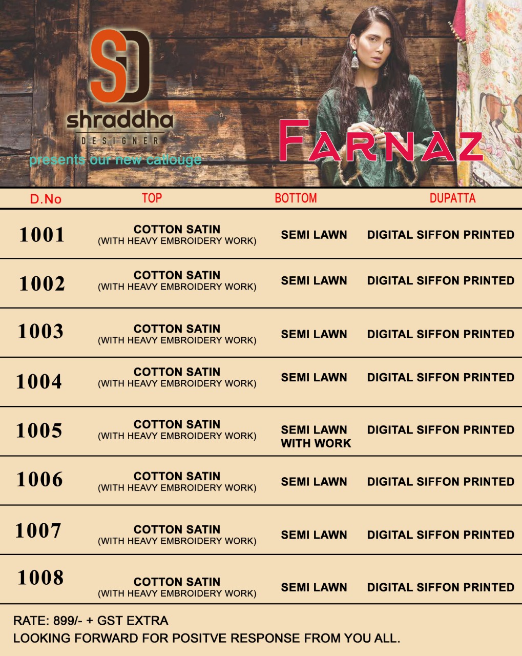 Buy Online Farnaz By Sharaddha Designer 1001 Series Fancy Cotton Satin Pakistani Style Salwar Kameez Catlog Wholesale Dealer Surat 8 Pcs of Full Catalogue at Wholesale Price. Looking for Farnaz By Sharaddha Designer 1001 Series Fancy Cotton Satin Pakistani Style Salwar Kameez Catlog Wholesale Dealer Surat Full Catalouge at Best Price? Buy Now Farnaz By Sharaddha Designer 1001 Series Fancy Cotton Satin Pakistani Style Salwar Kameez Catlog Wholesale Dealer Surat at Wholesale Rate of Rs 7192 with Total 8 Pcs from authroized dealer and supplier of Brand. Cost of Each piece is just only Rs 899 which is very low and affordable price to resale the product in your retail store ,This is Surat based Wholesale Supplier & Dealer of Brand. Click on Brand name to Know more about Brand's products.Call or Whatsapp on 9898838984 for booking or enquiry