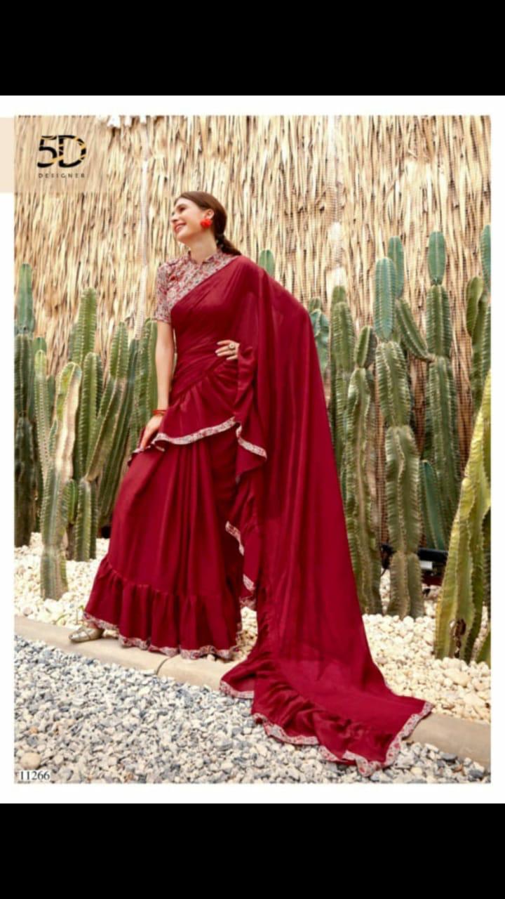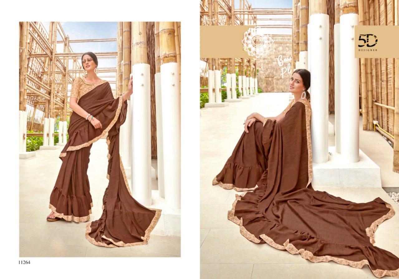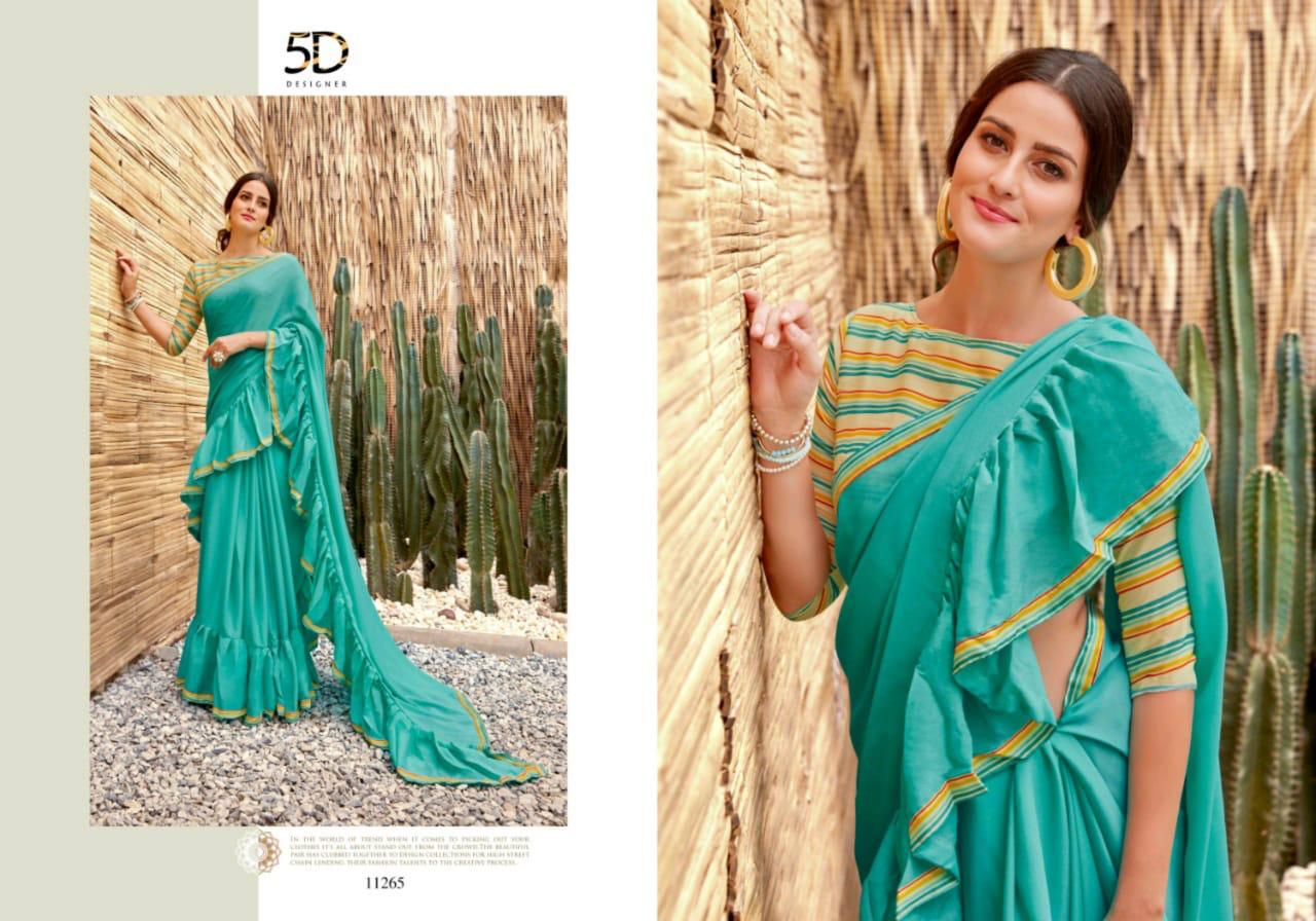_*FEMINA*_ _Brand:- *5D DESIGNER*_ _Rate:- *495-/*_ _Fabric:- *RIMZIM GEORGATE WITH FRILL AND PRINTED BLOUSE* _Total Designs:- *5*_ _Packing pcs :- set to set GST 5 Percent Extra. Delivery from tomorrow _Matching :- *SINGLE COLOR*_ _Cut :- *6/30mtr*_ |