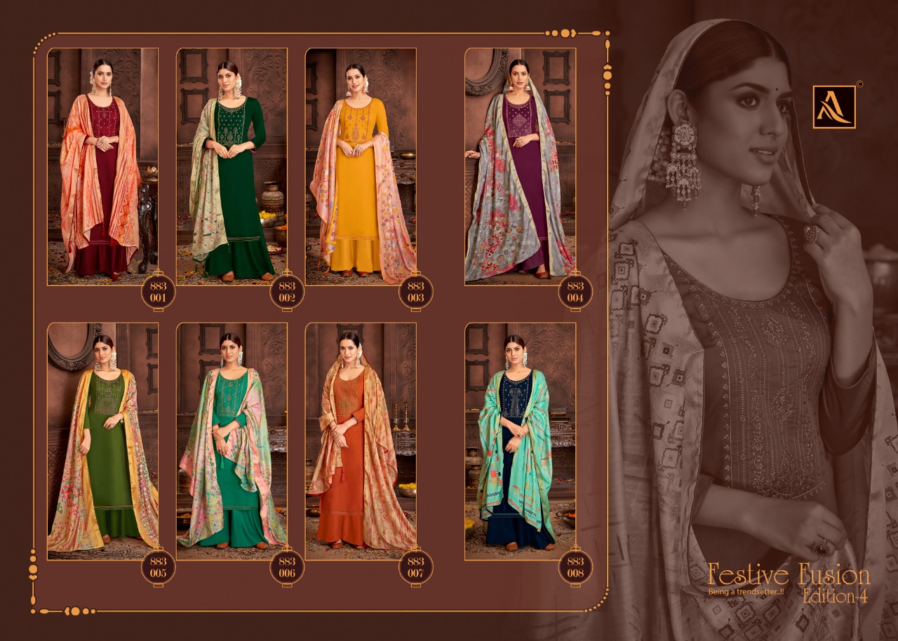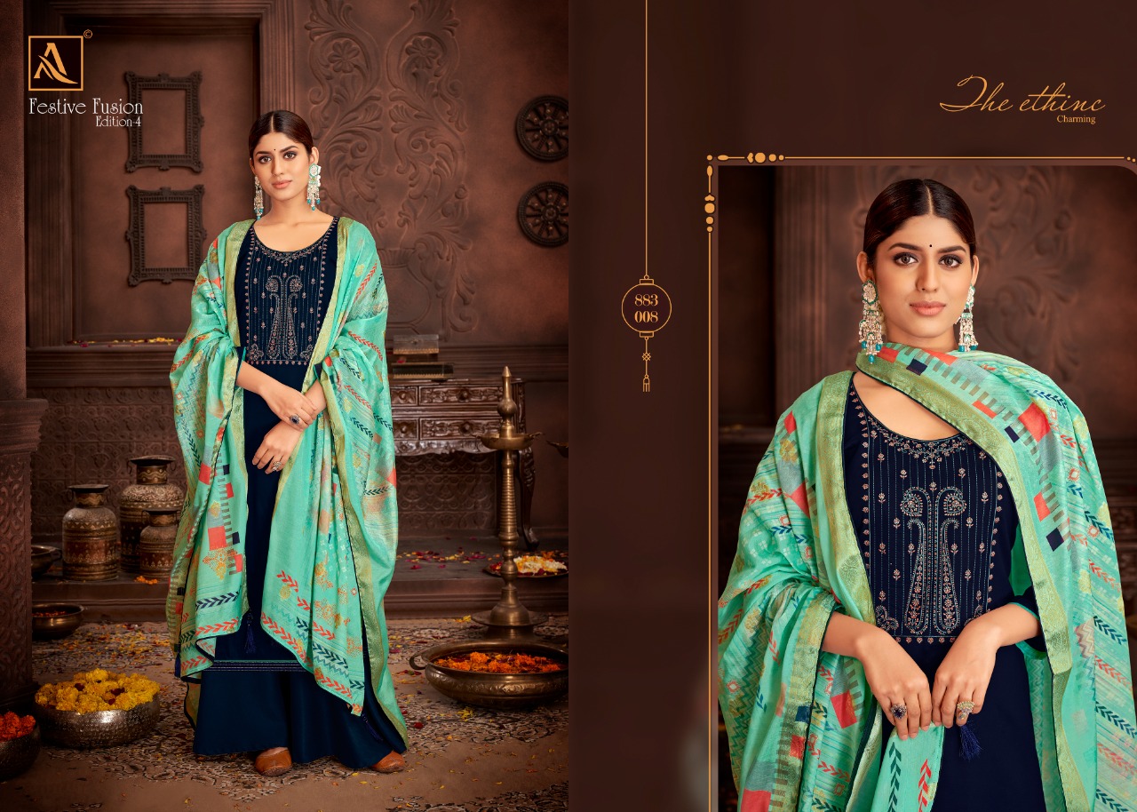 Buy Online Festive Fusion Vol 4 By Alok Suit Wholesale Supplier Traders In Surat 8 Pcs of Full Catalogue at Wholesale Price. Looking for Festive Fusion Vol 4 By Alok Suit Wholesale Supplier Traders In Surat Full Catalouge at Best Price? Buy Now Festive Fusion Vol 4 By Alok Suit Wholesale Supplier Traders In Surat at Wholesale Rate of Rs 7288 with Total 8 Pcs from authroized dealer and supplier of Brand. Cost of Each piece is just only Rs 911 which is very low and affordable price to resale the product in your retail store ,This is Surat based Wholesale Supplier & Dealer of Brand. Click on Brand name to Know more about Brand's products.Call or Whatsapp on 9898838984 for booking or enquiry