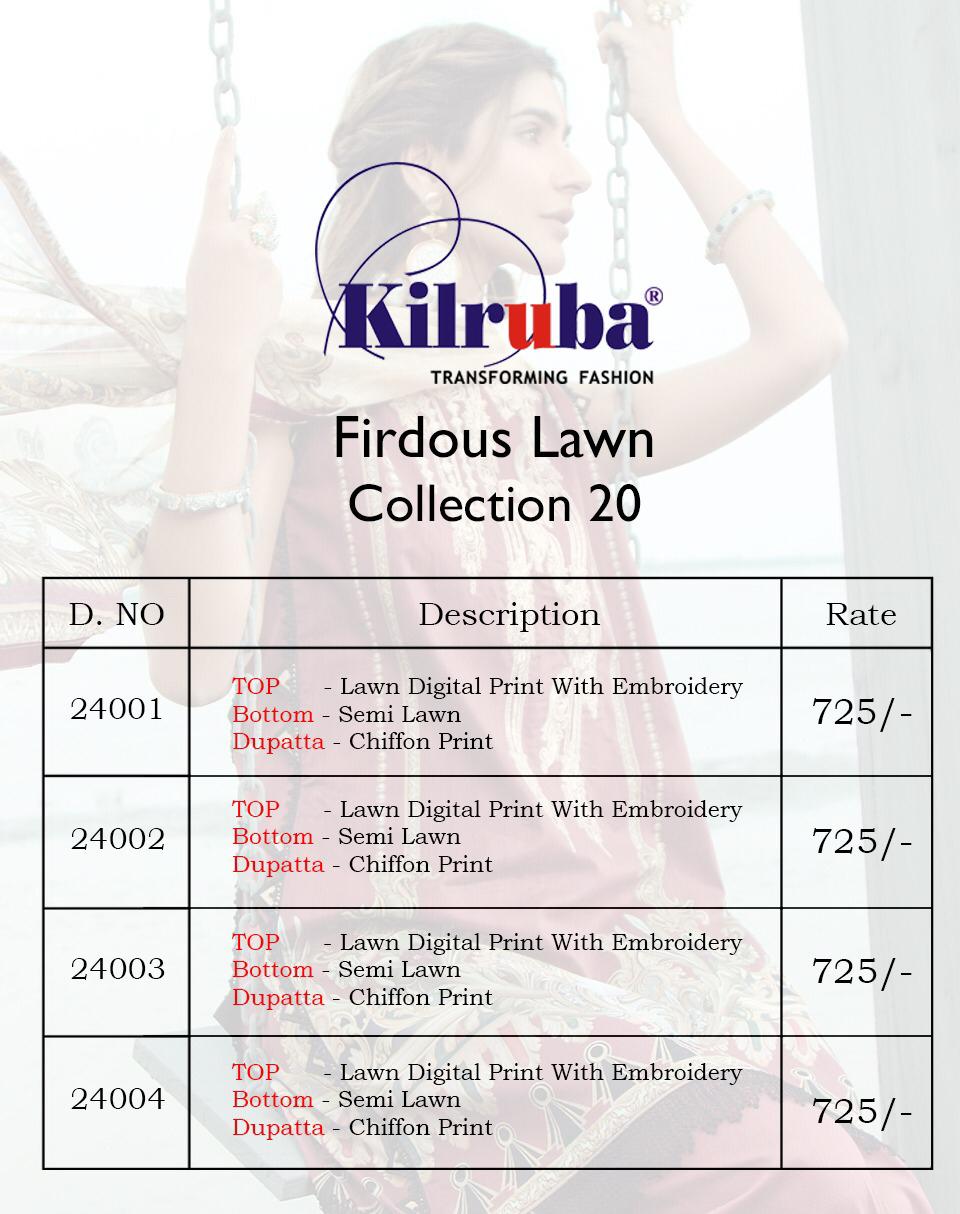Buy Online Firdouse Lawn Collection 20 By Kilruba Designer Suits Wholesale Supplier India 4 Pcs of Full Catalogue at Wholesale Price. Looking for Firdouse Lawn Collection 20 By Kilruba Designer Suits Wholesale Supplier India Full Catalouge at Best Price? Buy Now Firdouse Lawn Collection 20 By Kilruba Designer Suits Wholesale Supplier India at Wholesale Rate of Rs 2900 with Total 4 Pcs from authroized dealer and supplier of Brand. Cost of Each piece is just only Rs 725 which is very low and affordable price to resale the product in your retail store ,This is Surat based Wholesale Supplier & Dealer of Brand. Click on Brand name to Know more about Brand's products.Call or Whatsapp on 9898838984 for booking or enquiry