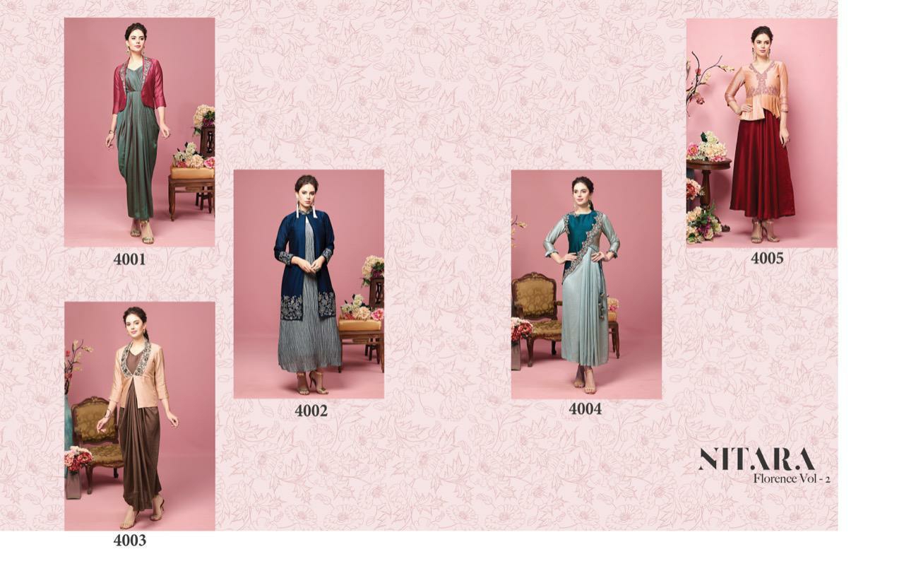 Buy Online Florence Vol 2 By Nitara Fancy Designer Party Wear Kurtis Wholesale Supplier Nd Dealer Gujarat 5 Pcs of Full Catalogue at Wholesale Price. Looking for Florence Vol 2 By Nitara Fancy Designer Party Wear Kurtis Wholesale Supplier Nd Dealer Gujarat Full Catalouge at Best Price? Buy Now Florence Vol 2 By Nitara Fancy Designer Party Wear Kurtis Wholesale Supplier Nd Dealer Gujarat at Wholesale Rate of Rs 6750 with Total 5 Pcs from authroized dealer and supplier of BRAND'S Brand. Cost of Each piece is just only Rs 1350 which is very low and affordable price to resale the product in your retail store ,This is Surat based Wholesale Supplier & Dealer of BRAND'S Brand. Click on Brand name to Know more about BRAND'S Brand's products.Call or Whatsapp on 9898838984 for booking or enquiry