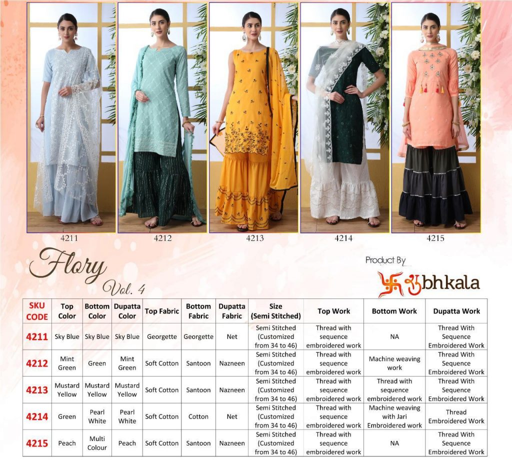 Buy Online Flory Vol 4 Series 4111 To 4115 Designer Suits Set And Single Wholesale Supplier And Dealer Gujarat 5 Pcs of Full Catalogue at Wholesale Price. Looking for Flory Vol 4 Series 4111 To 4115 Designer Suits Set And Single Wholesale Supplier And Dealer Gujarat Full Catalouge at Best Price? Buy Now Flory Vol 4 Series 4111 To 4115 Designer Suits Set And Single Wholesale Supplier And Dealer Gujarat at Wholesale Rate of Rs 7500 with Total 5 Pcs from authroized dealer and supplier of Brand. Cost of Each piece is just only Rs 1500 which is very low and affordable price to resale the product in your retail store ,This is Surat based Wholesale Supplier & Dealer of Brand. Click on Brand name to Know more about Brand's products.Call or Whatsapp on 9898838984 for booking or enquiry