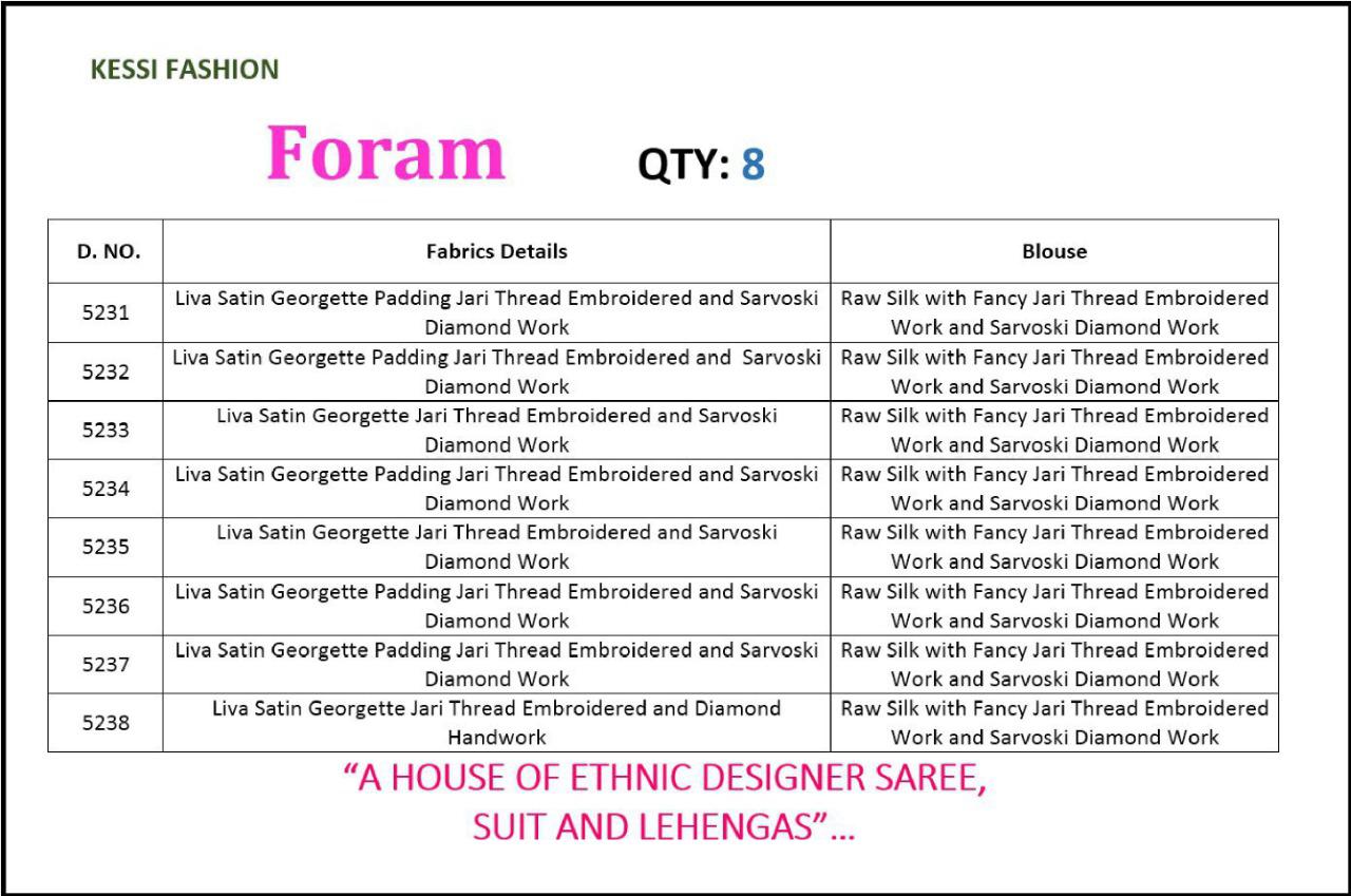 Brand - Kessi saree. Type - Saree. Catlog name - FORAM . Series - 5231 to 5238. Rate - 1299 per Pcs . Single extra 100 GST 5 Percent Extra. Delivery- 2-3 days |