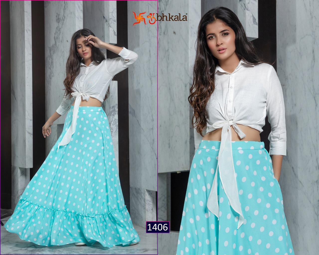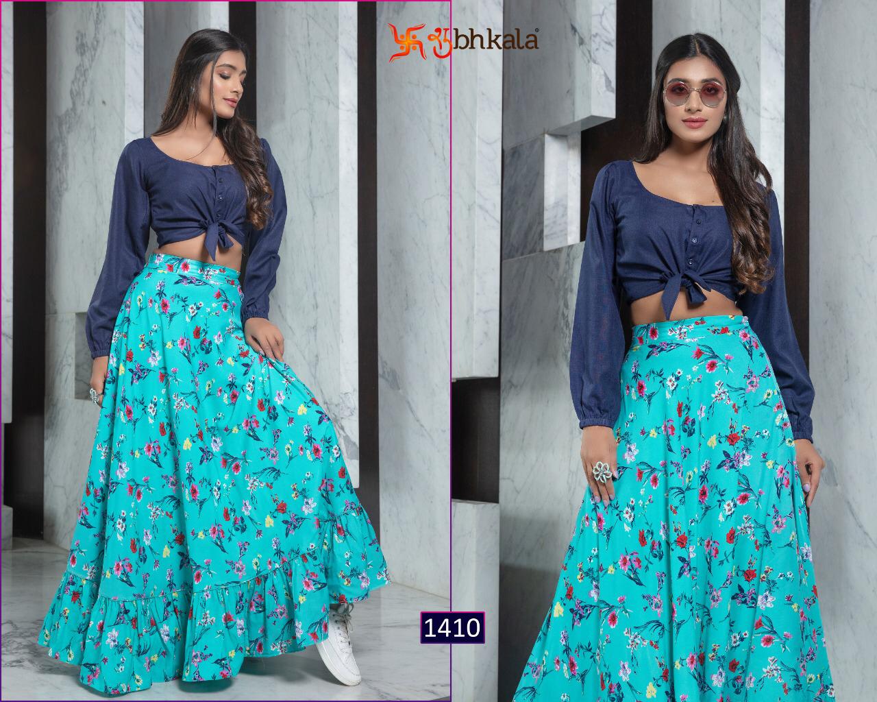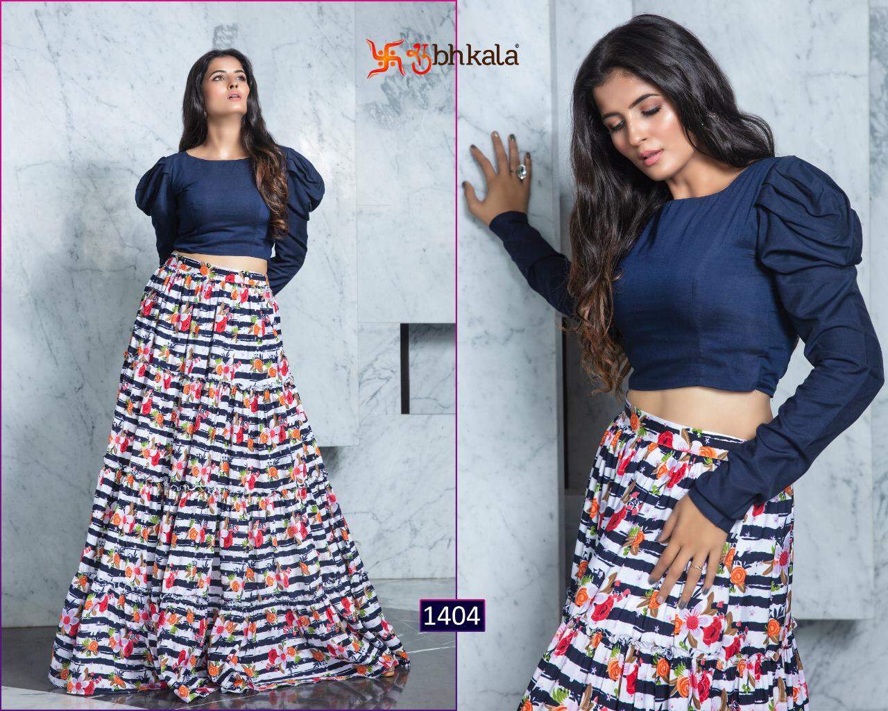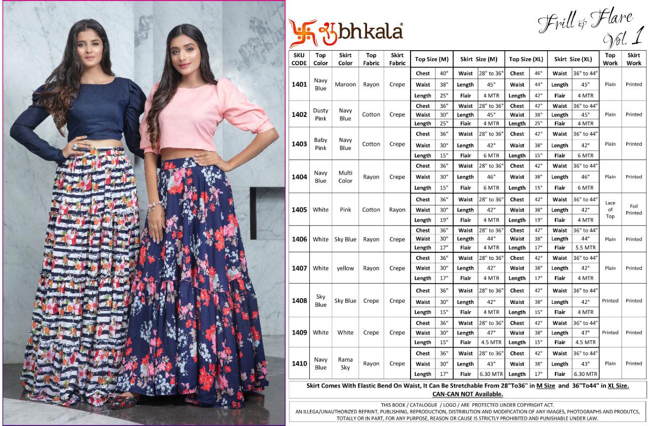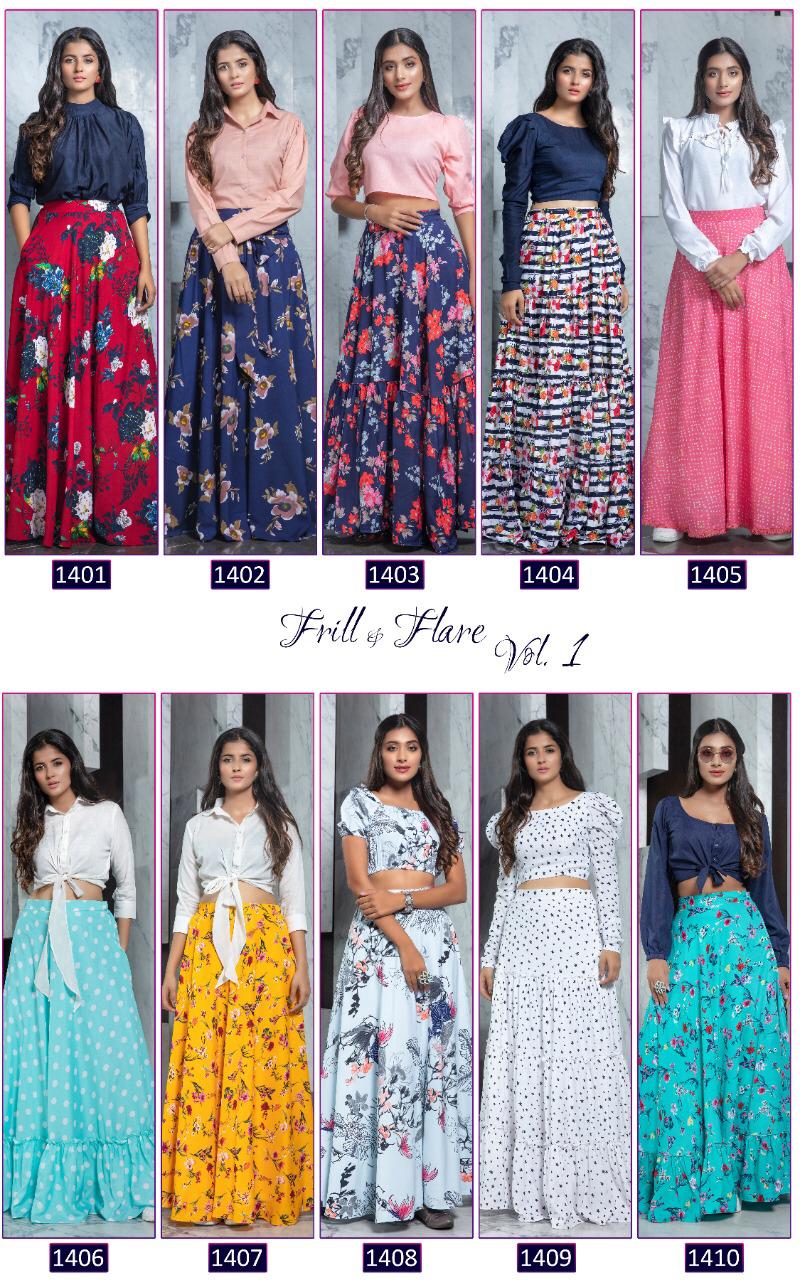 ```NEW ARRIVAL``` ? *Frill & Flare Vol. 1* ? ? New Exclusive Designer Printer Crop Top Collection ? *RATE LIST* *1401 Â? 899/-* *1402 Â? 899/-* *1403 Â? 899/-* *1404 Â? 899/-* *1405 Â? 899/-* *1406 Â? 899/-* *1407 Â? 899/-* *1408 Â? 899/-* *1409 Â? 899/-* *1410 Â? 899/-* *Type:* Stitched. *Weight:* 1 KG. *NOTE:* Skirt Comes with Elastic Bend on Waist, If can Be Stretchable From 28Â? to 36Â? in *M SIZE* & 36Â? to 44Â? in *XL SIZE*. *CAN-CAN Not Available.* Set & loose & singel ? Real Pic Available. ? ? Assured Quality ? ? Authentic Original Product ? Ready to Shipping Product. ? ?? MADE IN INDIA ?? ?? *NOTE::* ?? THIS BOOK / CATALOGS / LOGO / ARE PROTECTED UNDER COPYRIGHT ACT. AN ILLEGA/UNAUTHORIZED REPRINT, PUBLISHING, REPRODUCTION, DISTRIBUTION AND MODIFICATION OF ANY IMAGES, PHOTOGRAPHS AND PRODUCTS, TOTALLY OR IN PART, FOR ANY PURPOSE, REASON OR CAUSE IS STRICTLY PROHIBITED AND PUNISHABLE UNDER LAW. |