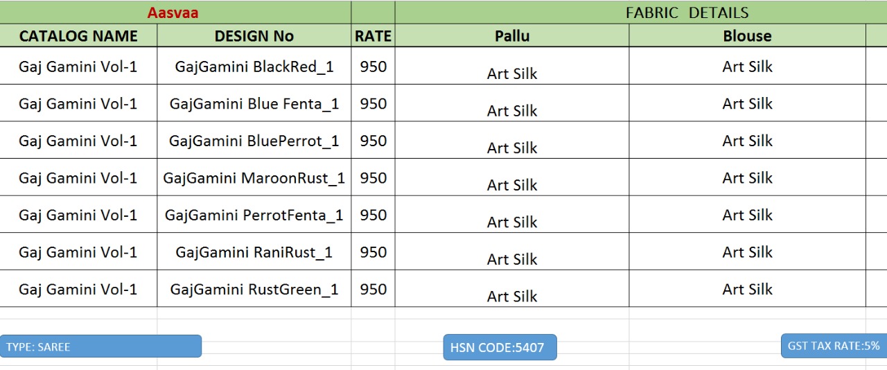 Buy Online Gaj Gamini Vol 1 By Nitya Nx Art Silk Saree Wholesaler Surat 7 Pcs of Full Catalogue at Wholesale Price. Looking for Gaj Gamini Vol 1 By Nitya Nx Art Silk Saree Wholesaler Surat Full Catalouge at Best Price? Buy Now Gaj Gamini Vol 1 By Nitya Nx Art Silk Saree Wholesaler Surat at Wholesale Rate of Rs 6650 with Total 7 Pcs from authroized dealer and supplier of BRAND'S Brand. Cost of Each piece is just only Rs 950 which is very low and affordable price to resale the product in your retail store ,This is Surat based Wholesale Supplier & Dealer of BRAND'S Brand. Click on Brand name to Know more about BRAND'S Brand's products.Call or Whatsapp on 9898838984 for booking or enquiry