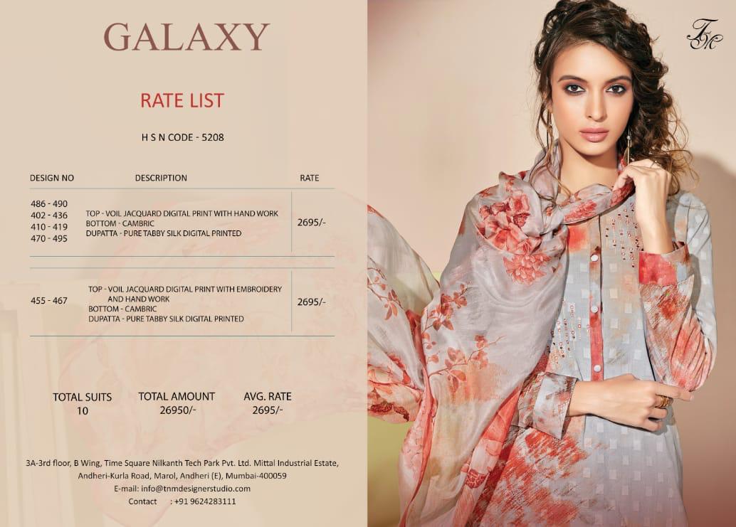 Buy Online Galaxy By T And M Voil Jacquard Digital Printed Designer Party Wear Suits Wholesale Supplier And Dealer Gujarat 10 Pcs of Full Catalogue at Wholesale Price. Looking for Galaxy By T And M Voil Jacquard Digital Printed Designer Party Wear Suits Wholesale Supplier And Dealer Gujarat Full Catalouge at Best Price? Buy Now Galaxy By T And M Voil Jacquard Digital Printed Designer Party Wear Suits Wholesale Supplier And Dealer Gujarat at Wholesale Rate of Rs 26950 with Total 10 Pcs from authroized dealer and supplier of Brand. Cost of Each piece is just only Rs 2695 which is very low and affordable price to resale the product in your retail store ,This is Surat based Wholesale Supplier & Dealer of Brand. Click on Brand name to Know more about Brand's products.Call or Whatsapp on 9898838984 for booking or enquiry