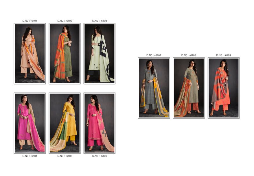 Buy Online Ganga Enaya 6101 Series Fancy Cotton Printed Salwar Kameez Catlog Wholesale Dealer And Supplier Surat 9 Pcs of Full Catalogue at Wholesale Price. Looking for Ganga Enaya 6101 Series Fancy Cotton Printed Salwar Kameez Catlog Wholesale Dealer And Supplier Surat Full Catalouge at Best Price? Buy Now Ganga Enaya 6101 Series Fancy Cotton Printed Salwar Kameez Catlog Wholesale Dealer And Supplier Surat at Wholesale Rate of Rs 12330 with Total 9 Pcs from authroized dealer and supplier of GANGA Brand. Cost of Each piece is just only Rs 1370 which is very low and affordable price to resale the product in your retail store ,This is Surat based Wholesale Supplier & Dealer of GANGA Brand. Click on Brand name to Know more about GANGA Brand's products.Call or Whatsapp on 9898838984 for booking or enquiry