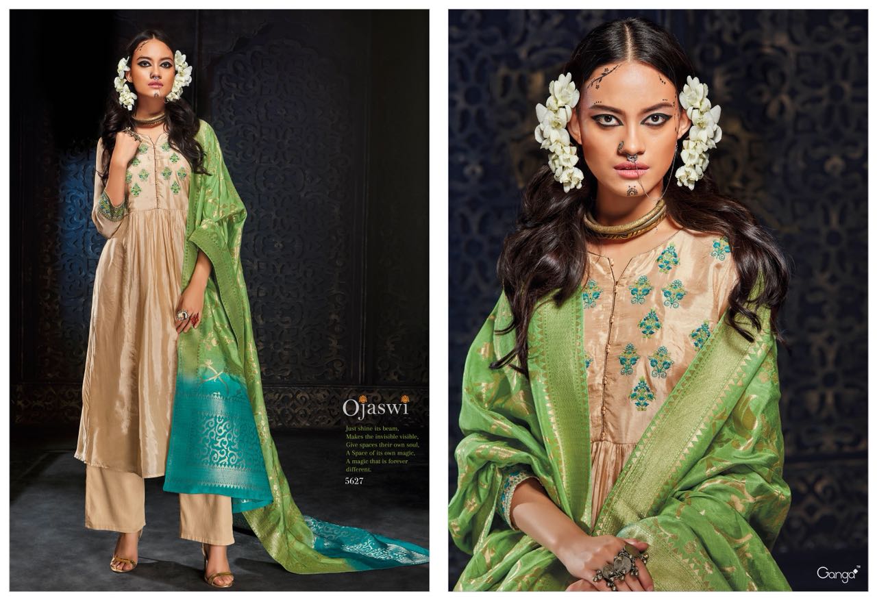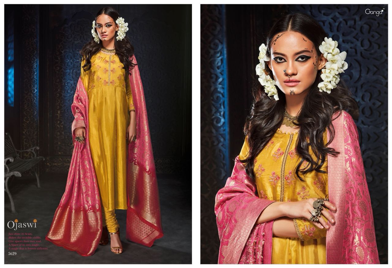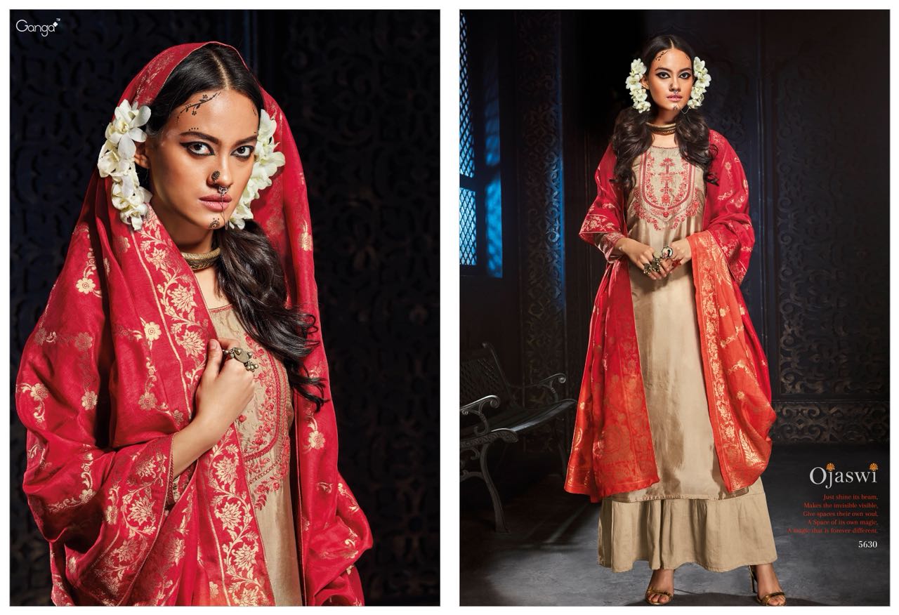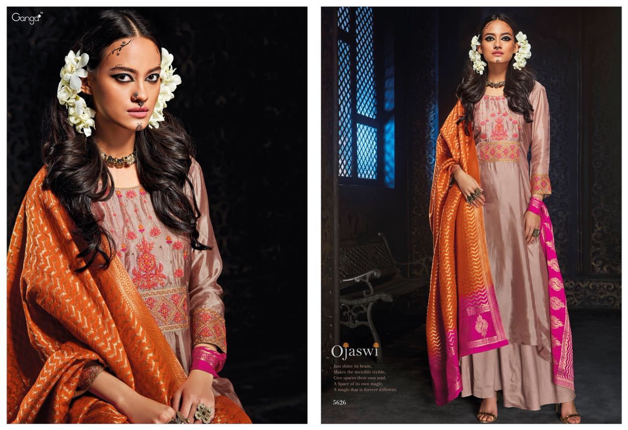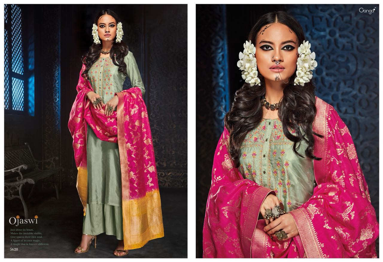 GANGA launches its heavy fancy festive collection catalogue OJASWI Top habutai silk solid with Emb and hand work Bottom cotton satin solid Dupatta banarsi silk heavy jari jaq with shaded (big width ) *2500 per Pcs * Set to set . GST 5 Percent Extra. Book your order. 5%GST APPLICABLE ONLY SET TO SET DELIVERY 2 DAYS |