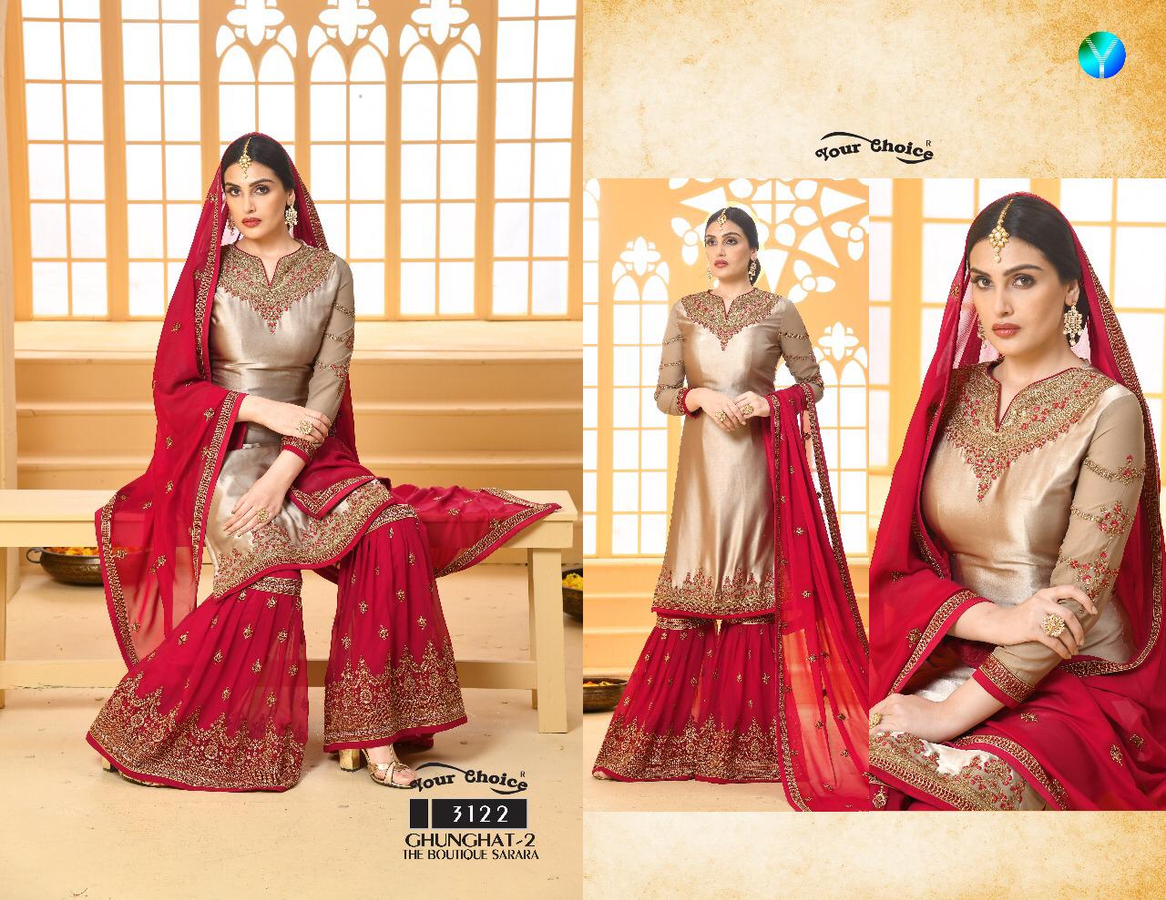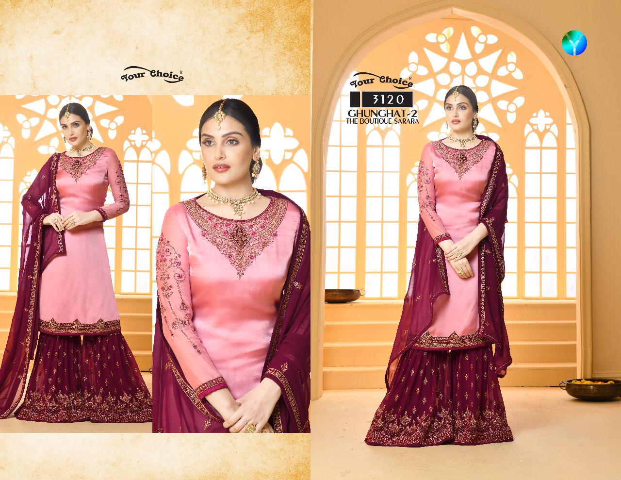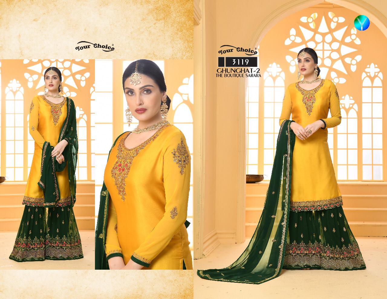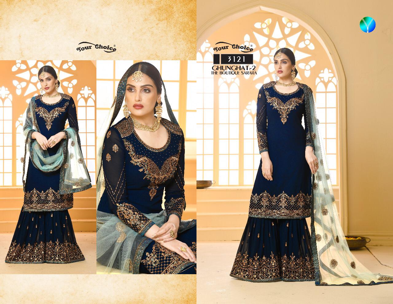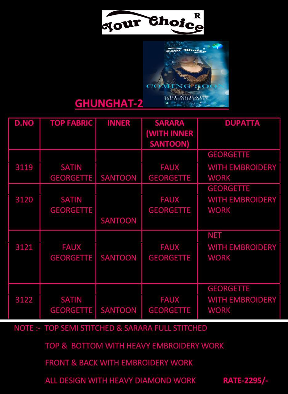 Buy Online Ghunghat 2 Your Choice Series 3119 To 3122 Wholesale 4 Pcs of Full Catalogue at Wholesale Price. Looking for Ghunghat 2 Your Choice Series 3119 To 3122 Wholesale Full Catalouge at Best Price? Buy Now Ghunghat 2 Your Choice Series 3119 To 3122 Wholesale at Wholesale Rate of Rs 9180 with Total 4 Pcs from authroized dealer and supplier of YOUR CHOICE Brand. Cost of Each piece is just only Rs 2295 which is very low and affordable price to resale the product in your retail store ,This is Surat based Wholesale Supplier & Dealer of YOUR CHOICE Brand. Click on Brand name to Know more about YOUR CHOICE Brand's products.Call or Whatsapp on 9898838984 for booking or enquiry