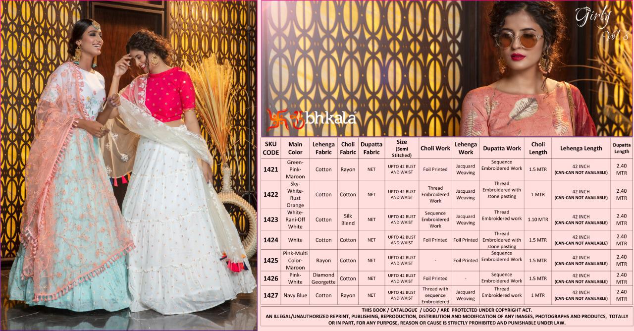 Buy Online Girly Vol 8 By Khushbu Series 1421 To 1427 Designer Lehngas Wholesale Supplier And Dealer Surat 0 Pcs of Full Catalogue at Wholesale Price. Looking for Girly Vol 8 By Khushbu Series 1421 To 1427 Designer Lehngas Wholesale Supplier And Dealer Surat Full Catalouge at Best Price? Buy Now Girly Vol 8 By Khushbu Series 1421 To 1427 Designer Lehngas Wholesale Supplier And Dealer Surat at Wholesale Rate of Rs 0 with Total 0 Pcs from authroized dealer and supplier of Brand. Cost of Each piece is just only Rs 0 which is very low and affordable price to resale the product in your retail store ,This is Surat based Wholesale Supplier & Dealer of Brand. Click on Brand name to Know more about Brand's products.Call or Whatsapp on 9898838984 for booking or enquiry