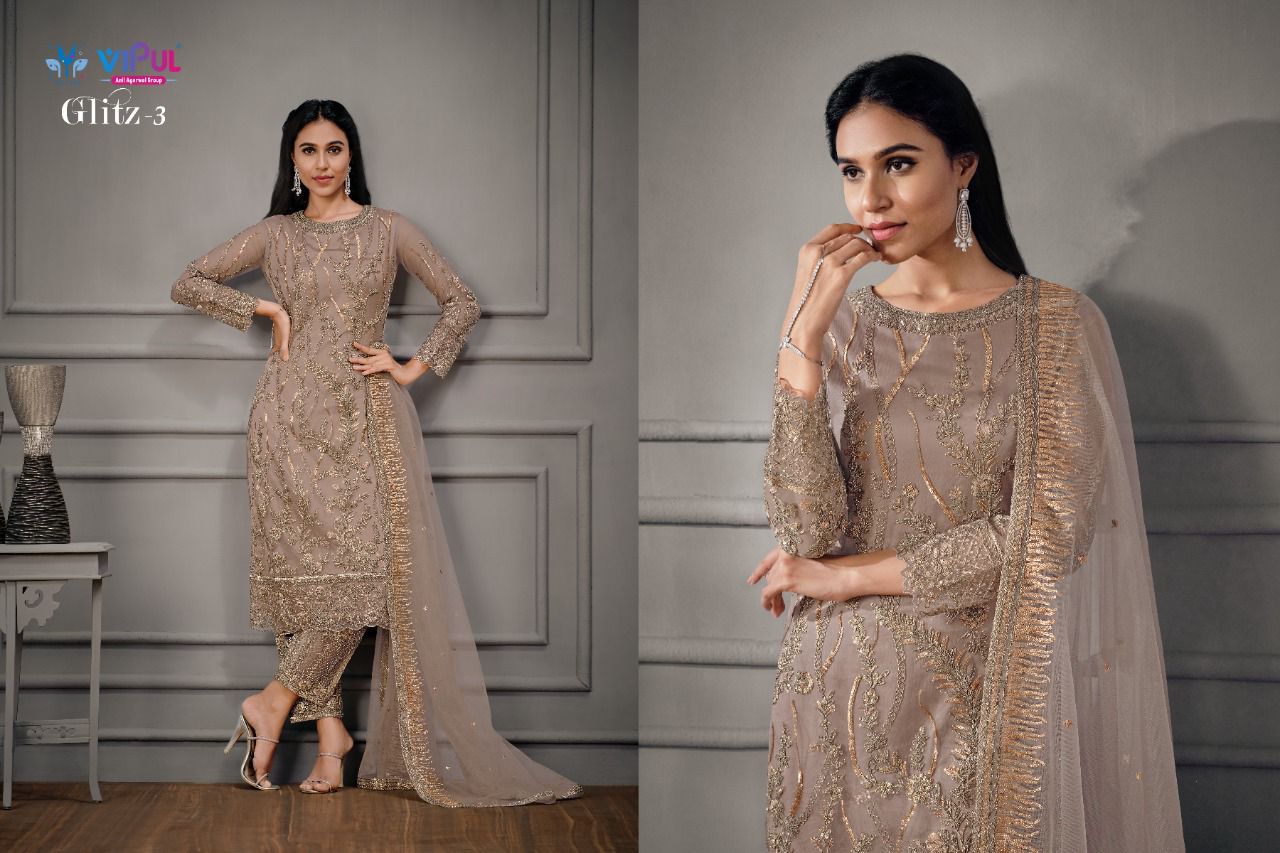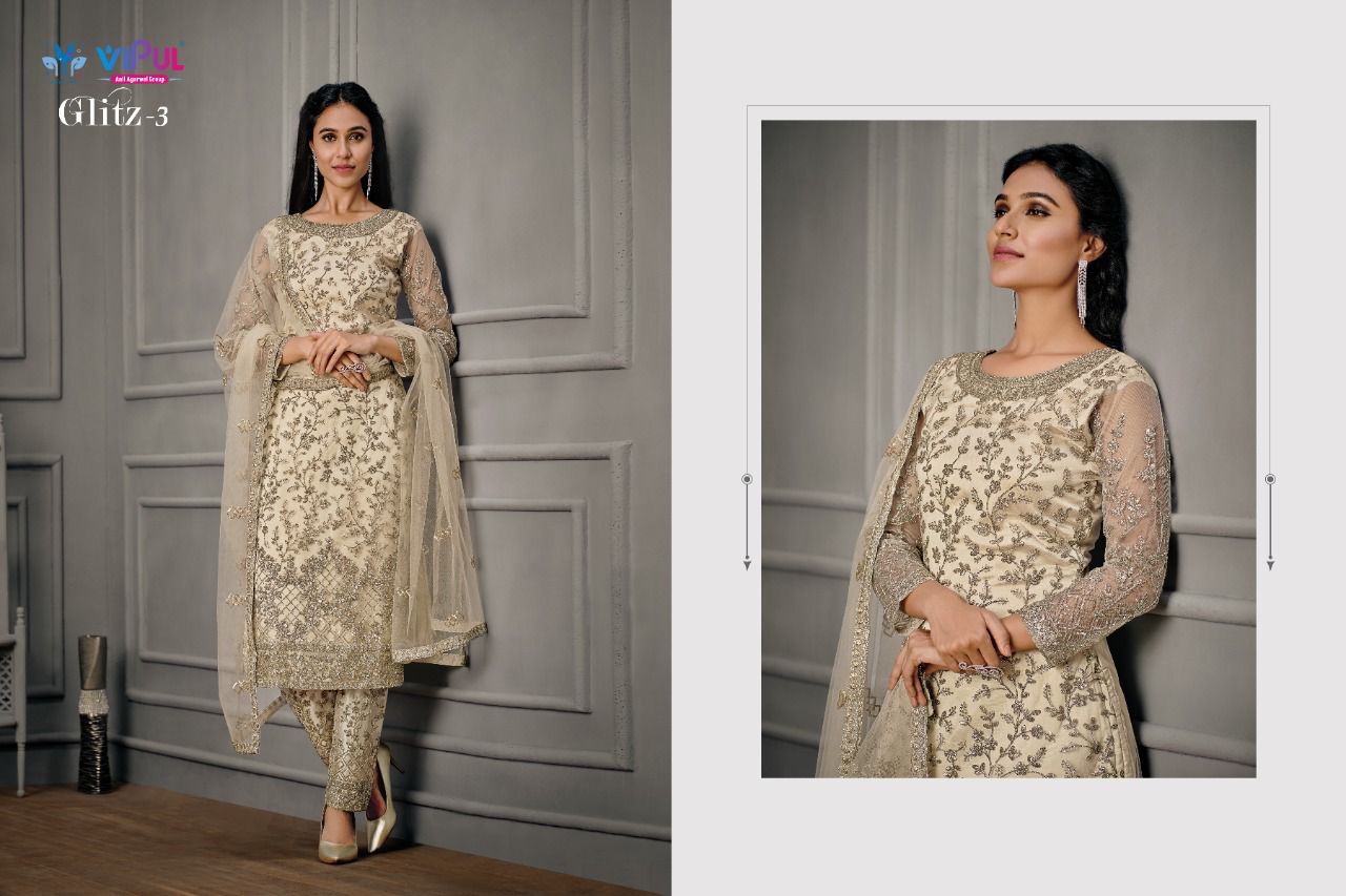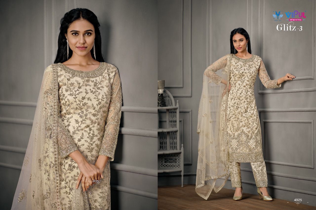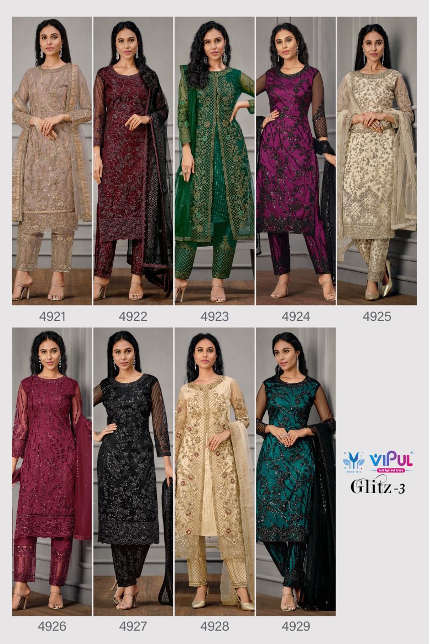 *Vipul launching* *GLITZ-Vol 3* Top - Net, Hand look work with Satin Inner Bottom - Satin with work on net. Dupatta - Net with work. Delivery 2/3 days Rate list attached +5% gst Single available 100+single |
