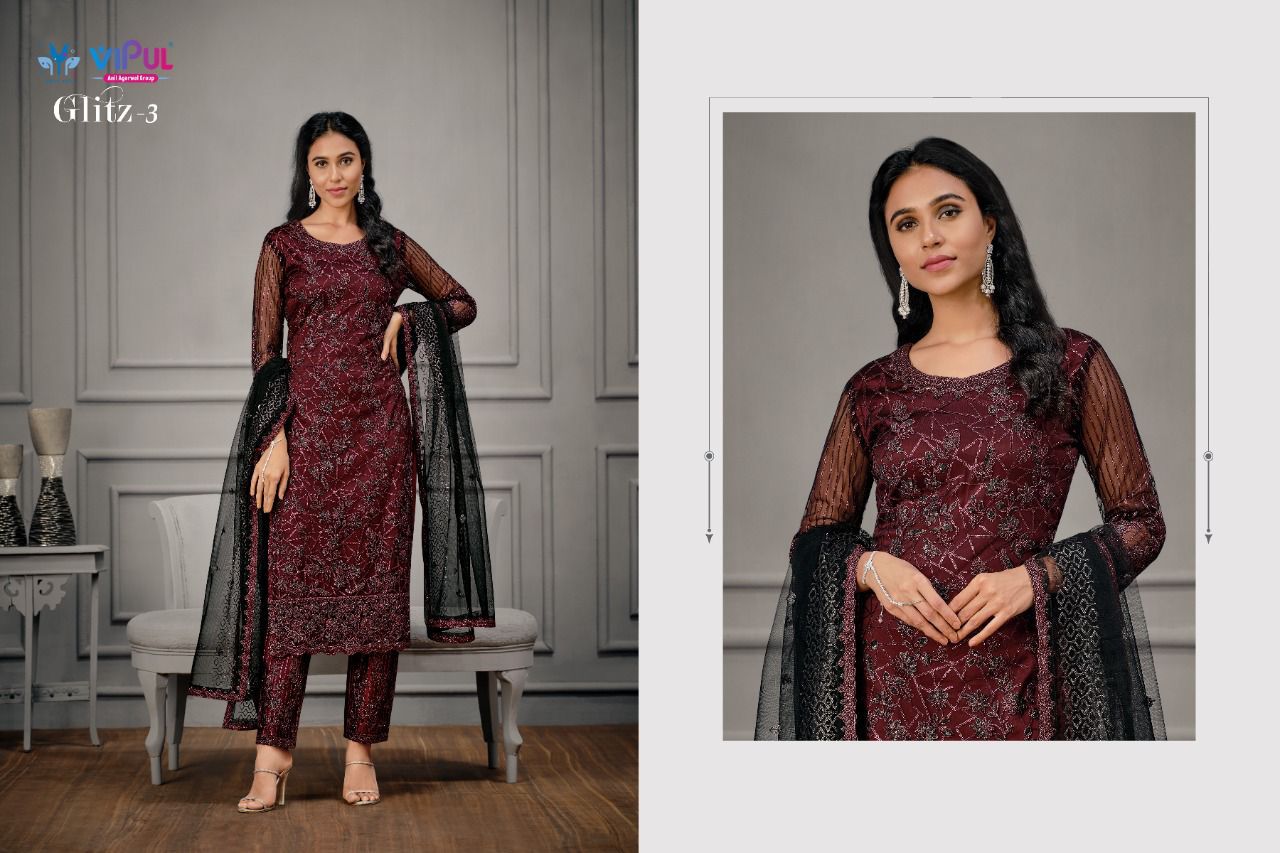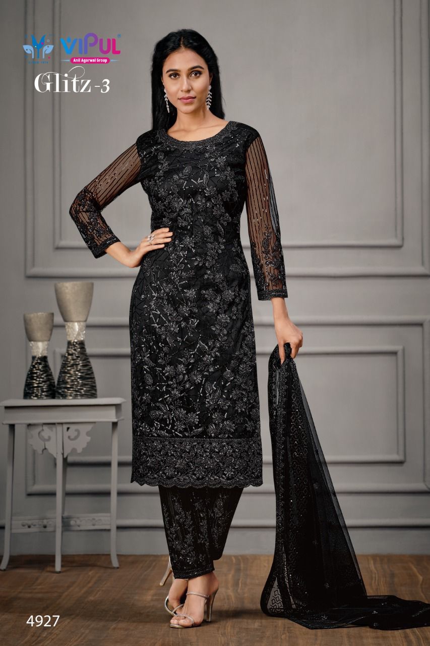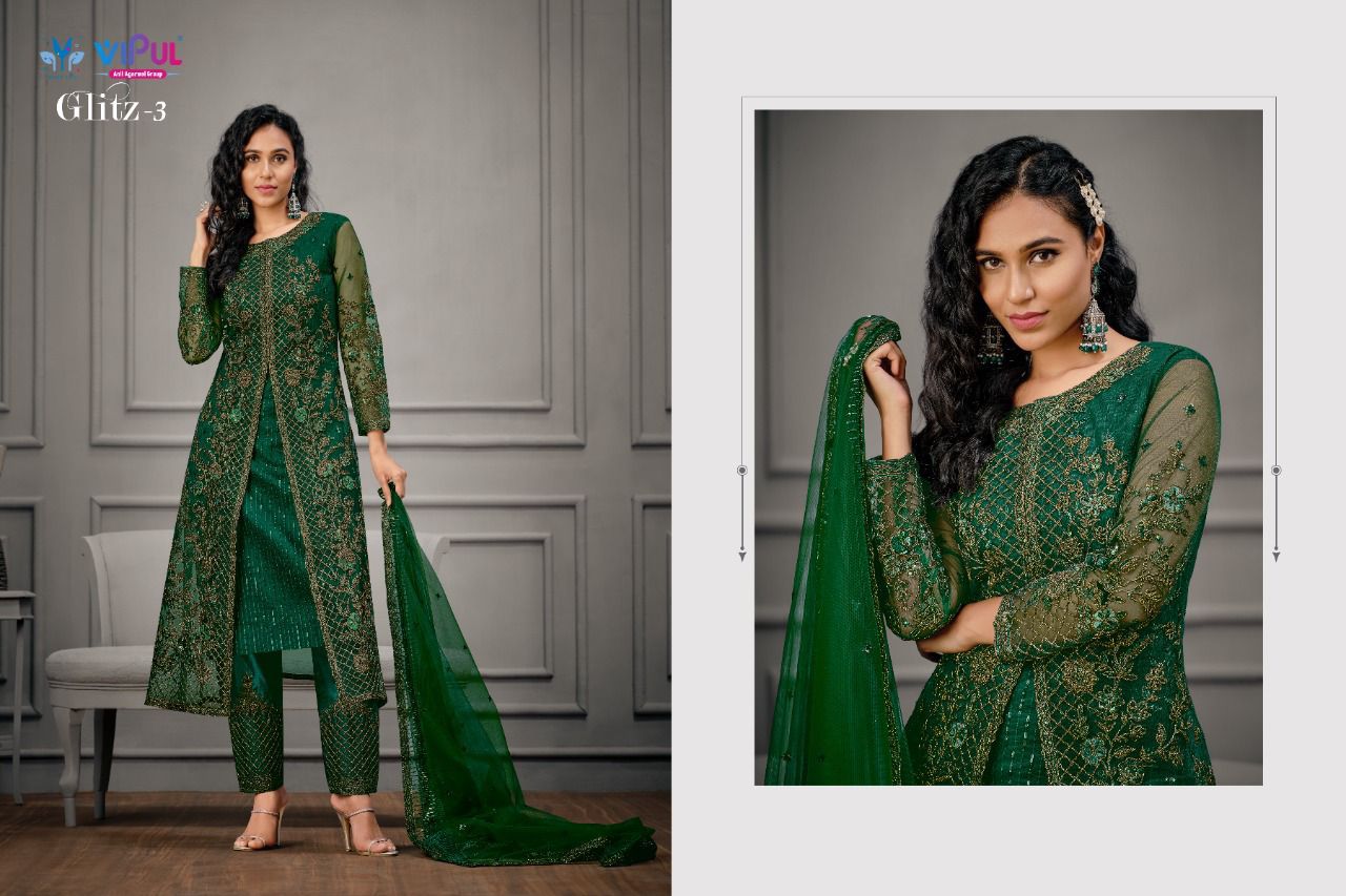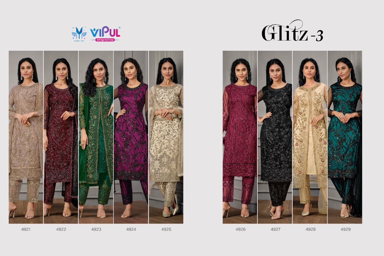 *Vipul launching* *GLITZ-Vol 3* Top - Net, Hand look work with Satin Inner Bottom - Satin with work on net. Dupatta - Net with work. Delivery 2/3 days Rate list attached +5% gst Single available 100+single |