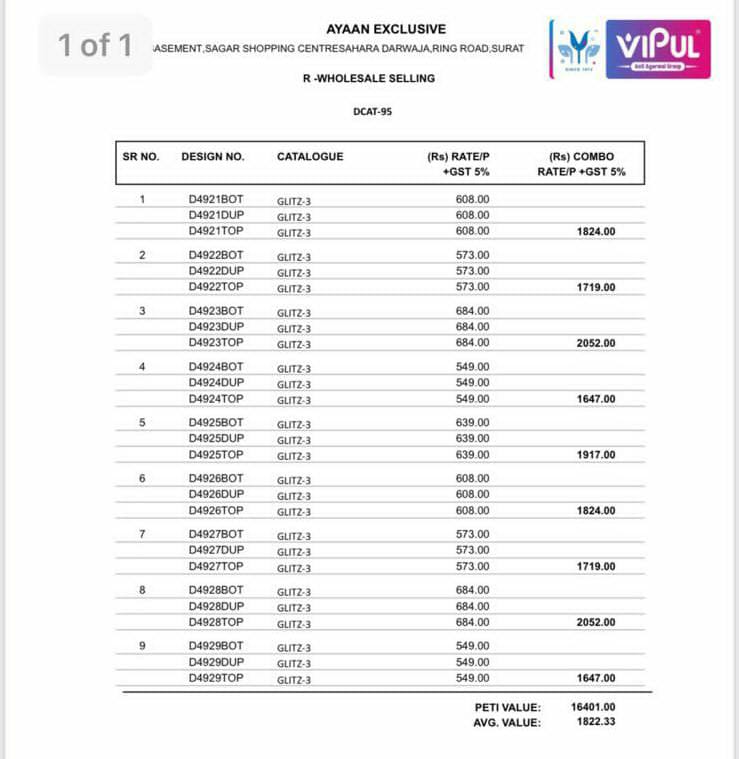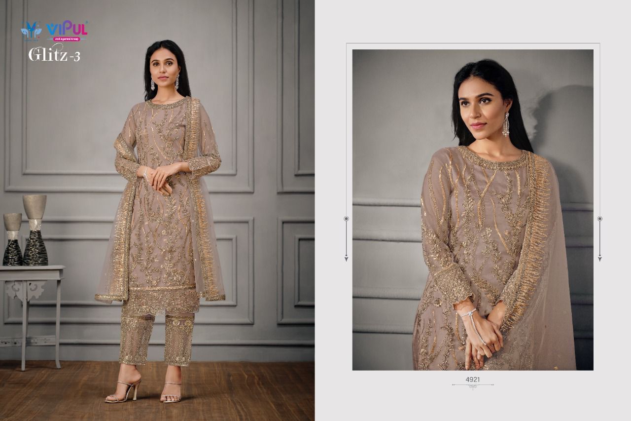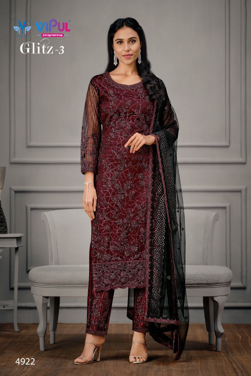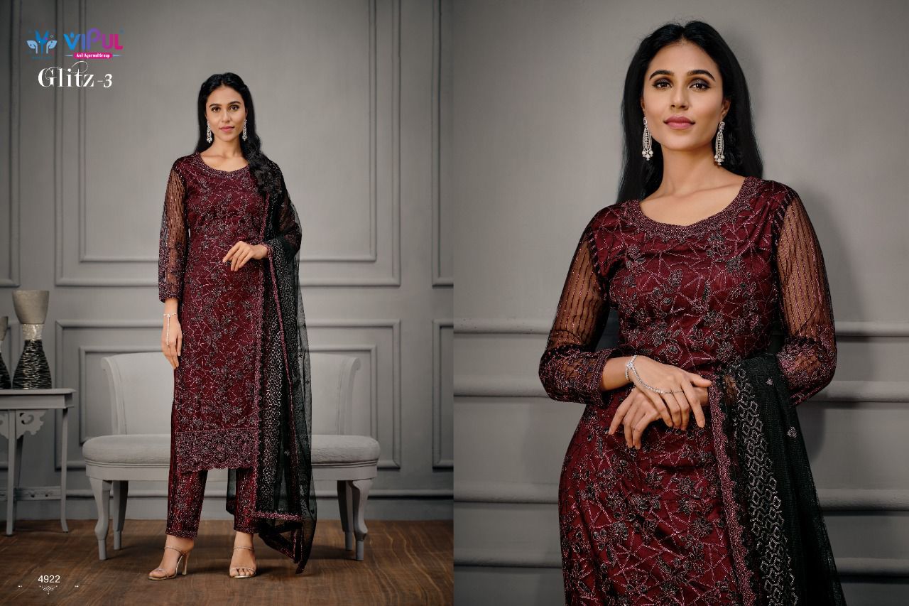 *Vipul launching* *GLITZ-Vol 3* Top - Net, Hand look work with Satin Inner Bottom - Satin with work on net. Dupatta - Net with work. Delivery 2/3 days Rate list attached +5% gst Single available 100+single |
