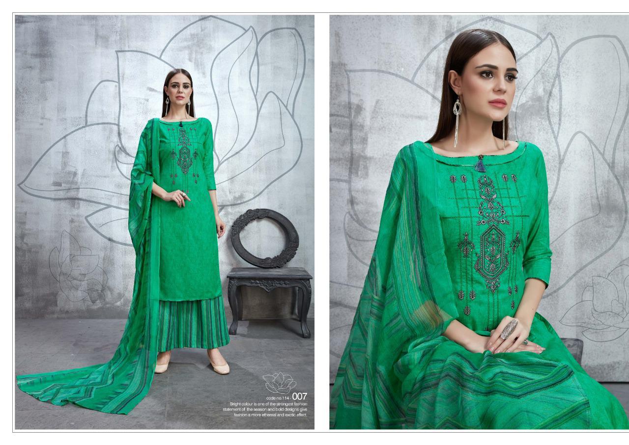 SARGAM PRINTS Presents ***GLORY*** *?Fabric Details?* *Top:* PURE ZAM WITH DESIGNER WORK Bottom :PURE COTTON PRINT *Dupatta:* PURE BEMBERG PRINT *Designs:* 8 PCS *Rate:* ?950 per pcs . Set To Set . GST 5 Percent Extra. Delivery 2-3 days *HSN CODE:* 5407 |