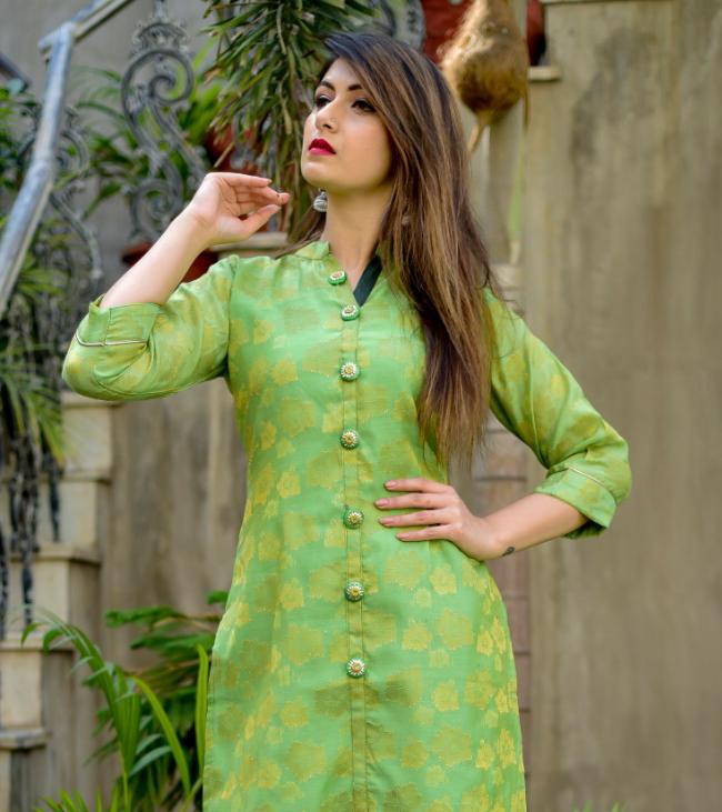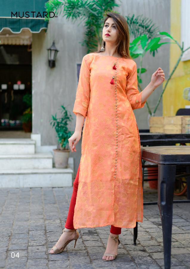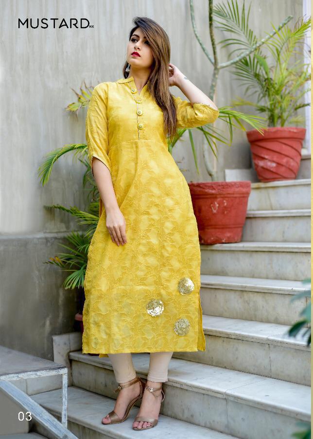 *Mustard NX* Catalouge : _*Goldstar*_ _Enjoy sparkling yet elegant sherwani style Kurtis with handwork buttons and Gota touches_ Fabric : *Banarasi silk with cotton inner* Length 48Â? Size : *38, 40, 42, 44* Price *445/- + Gst 5 Percent Extra Set To Set. _(Dispatching starts book your orders soon)_ |