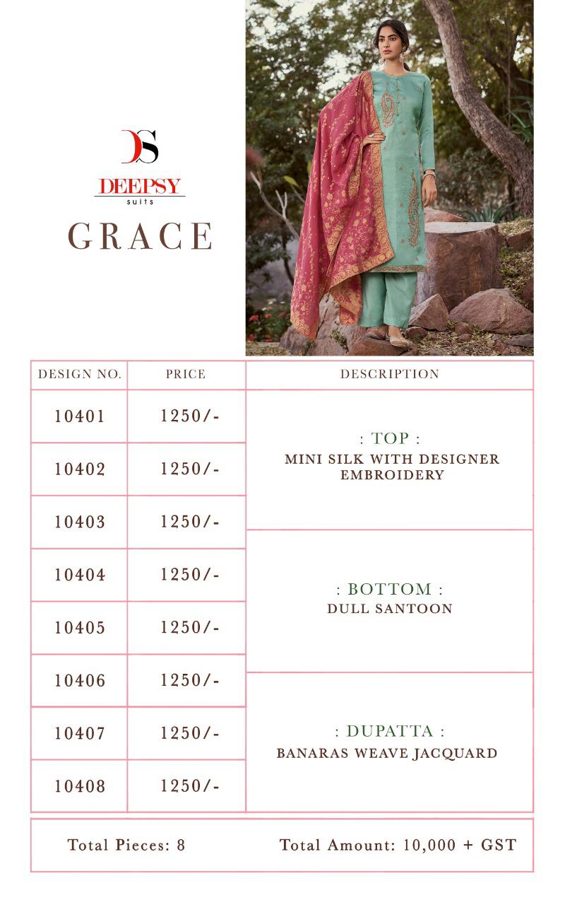 Buy Online Grace By Deepsy Suits Wholesale Suppliers And Dealer From India 8 Pcs of Full Catalogue at Wholesale Price. Looking for Grace By Deepsy Suits Wholesale Suppliers And Dealer From India Full Catalouge at Best Price? Buy Now Grace By Deepsy Suits Wholesale Suppliers And Dealer From India at Wholesale Rate of Rs 10000 with Total 8 Pcs from authroized dealer and supplier of DEEPSY Brand. Cost of Each piece is just only Rs 1250 which is very low and affordable price to resale the product in your retail store ,This is Surat based Wholesale Supplier & Dealer of DEEPSY Brand. Click on Brand name to Know more about DEEPSY Brand's products.Call or Whatsapp on 9898838984 for booking or enquiry