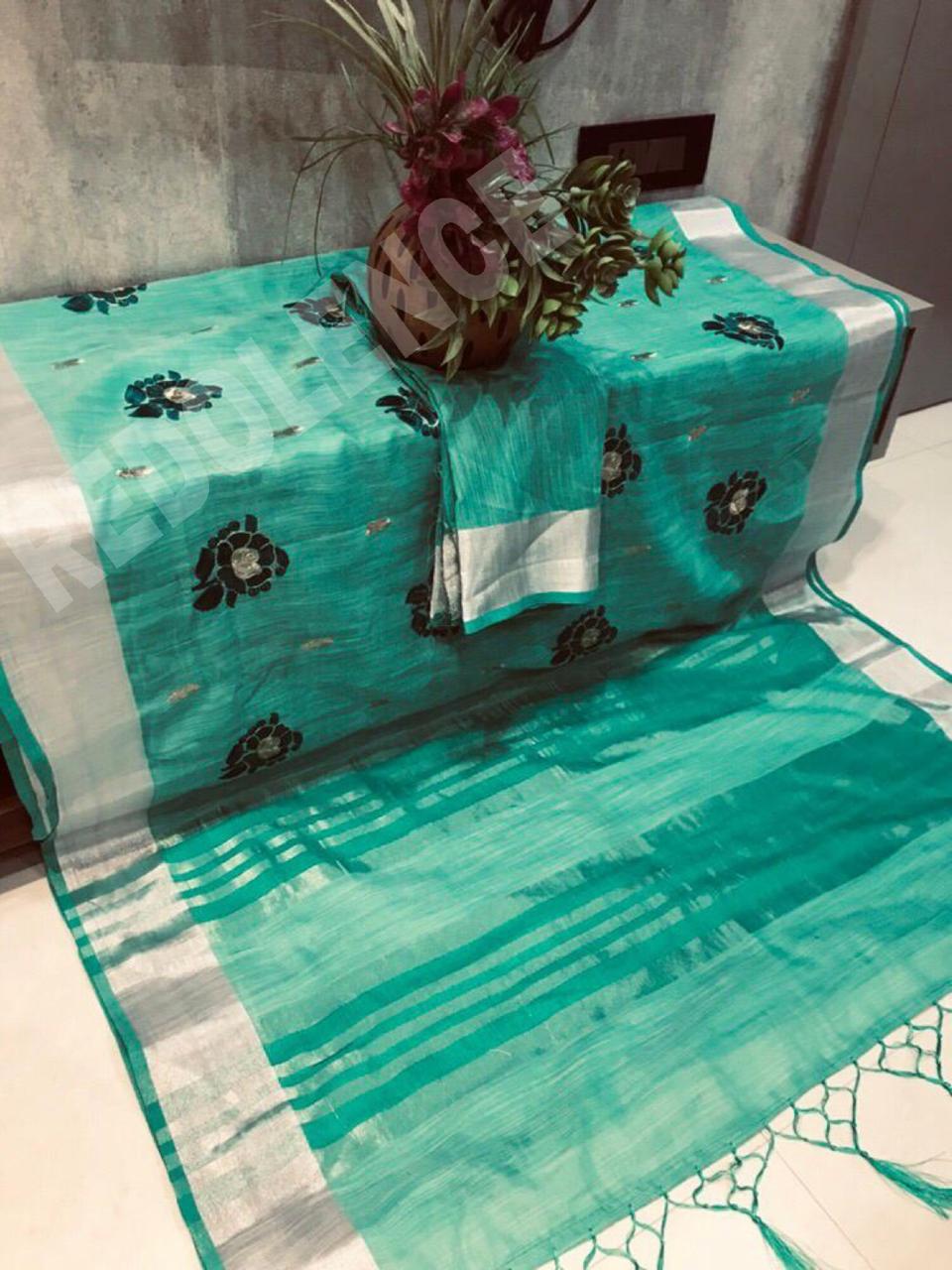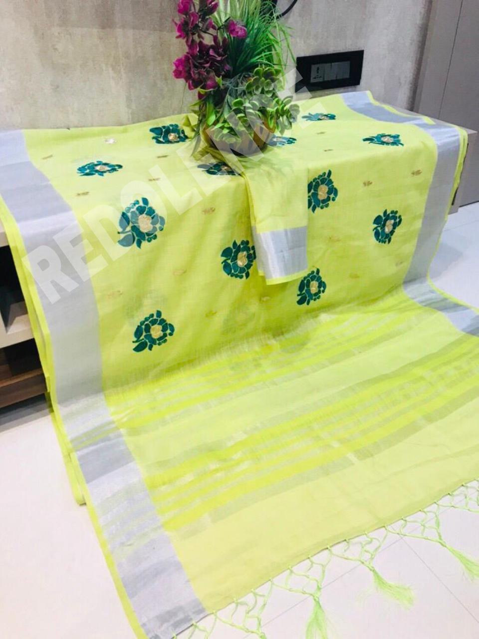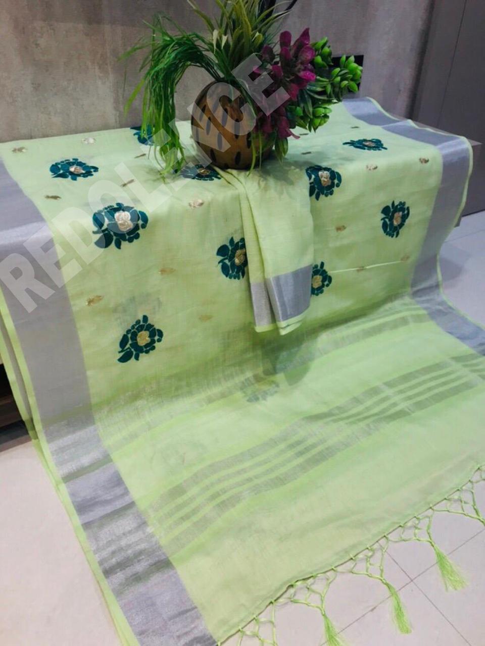 Green Rose By Redolence Fancy Pure Linen Silk Embroidery Saree Wholesaler Surat