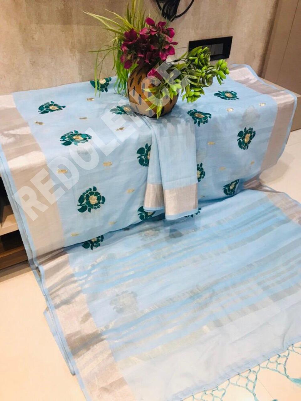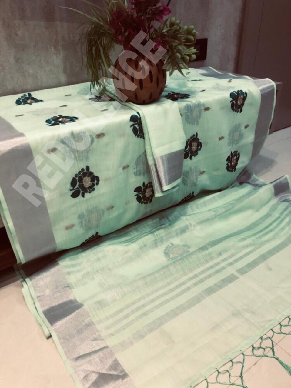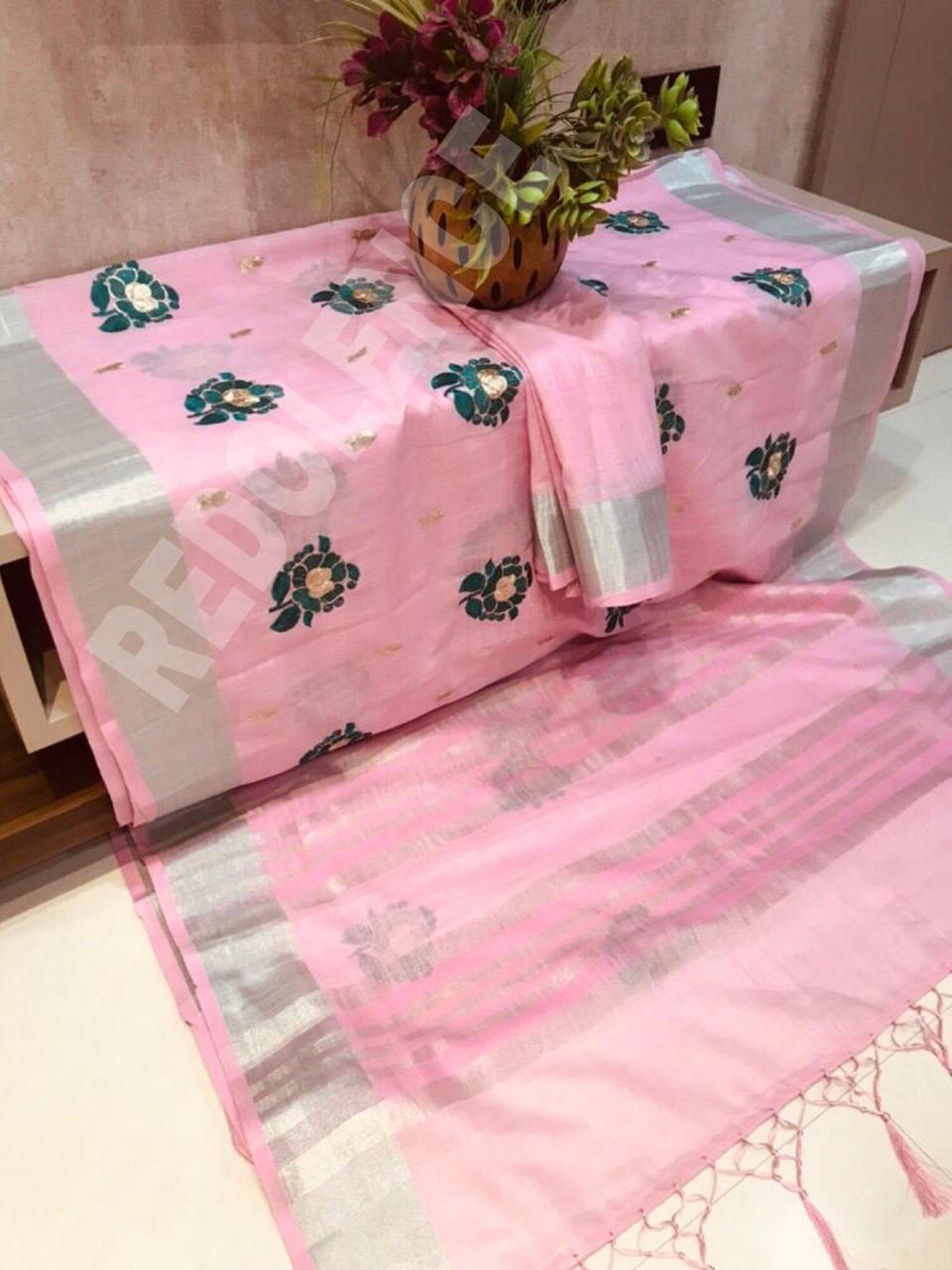 Green Rose By Redolence Fancy Pure Linen Silk Embroidery Saree Wholesaler Surat