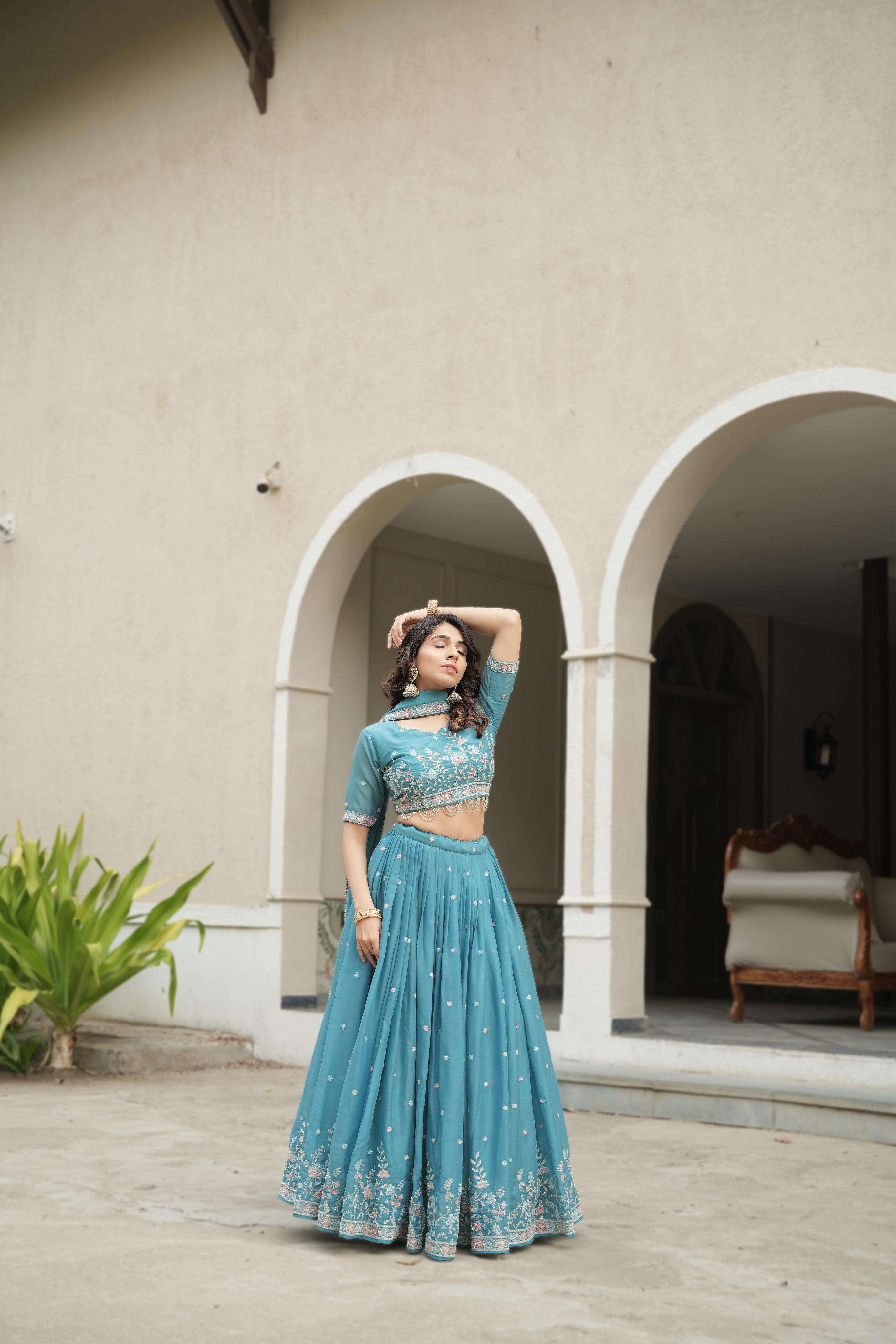 👉🏻Step into the spotlight with this vibrant turquoise blue lehenga choli, adorned with delicate floral embroidery and a bead designer border, pearl hangings on Blouse Piece adds a modern touch, making it an ideal choice for Sangeet nights, Weddings or Outings.✨👜
