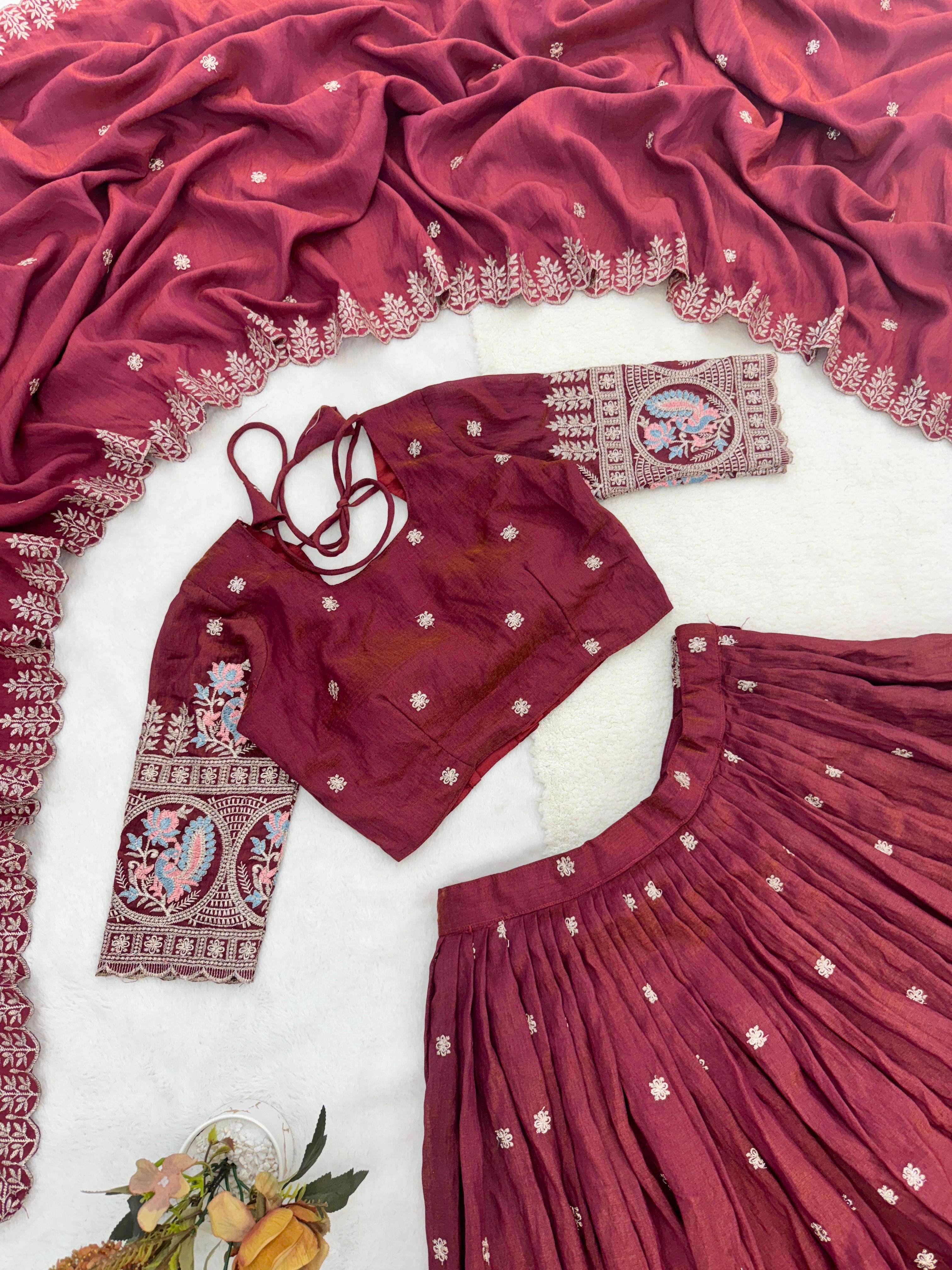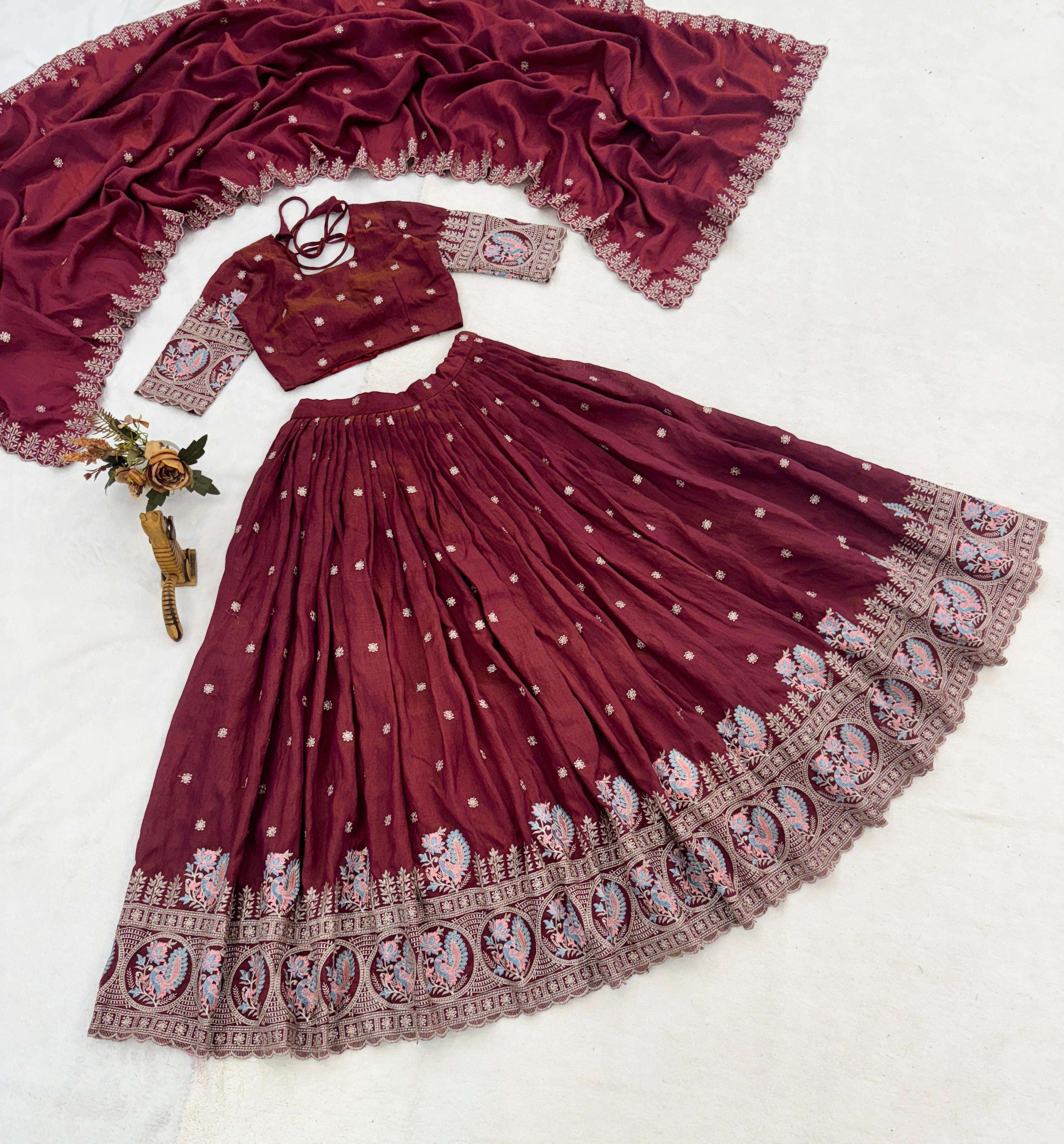 *_Classical Burgandy Embroidery Lehenga_*👜 ✨