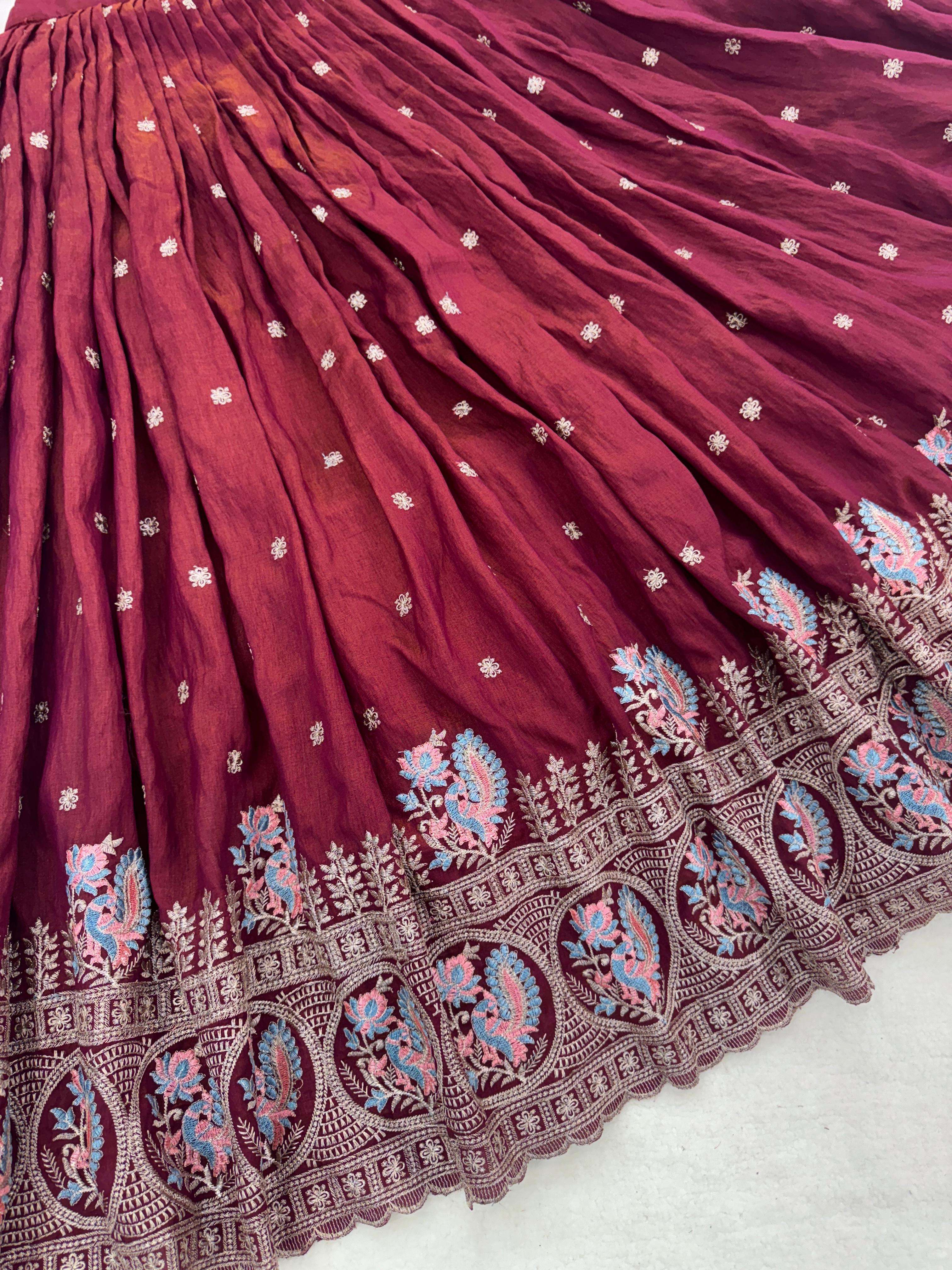 👉🏻Dazzle in our embroidered burgundy lehenga, Crafted in Natural Chinon Finish Vichitra Fabric, beautifully adorned with intricate Multicolored thread work for a regal festive look. Perfect for weddings and special occasions, this designer lehenga blends luxury, tradition, and timeless elegance.✨👜