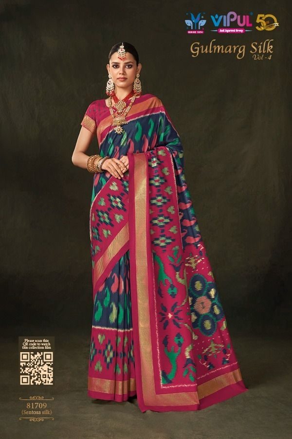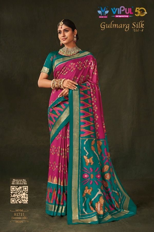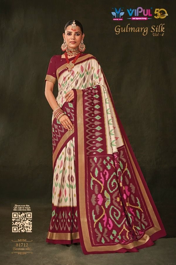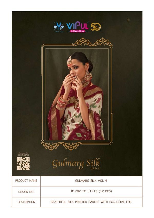 *BRAND NAME Â? VIPUL* *CATALOG NAME Â? GULMARG SILK VOL-4* *SERIES Â? 81702 TO 81713* *SAREE FABRIC : BEAUTIFUL SILK PRINTED SAREES WITH EXCLUSIVE FOIL* *Catalog RATE Â? 816/-* *GST 5% EXTRA* *SHIP EXTRA* SINGLE AVAILABLE 100+single |