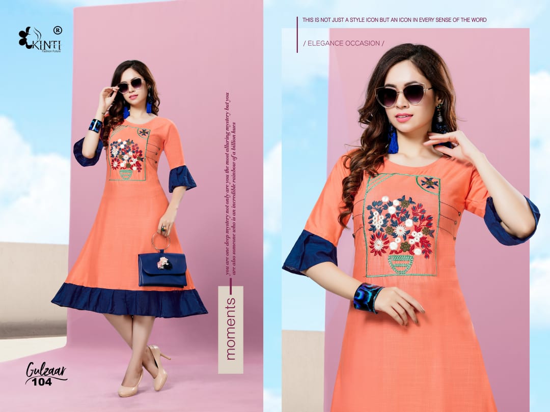 *Gulzar* by *KINTI®* Fabric : *Reyon Slub* Style : *Embroidery* *Hand Work* *Frill* Size. : *S M L XL XXL 3XL 4XL 5XL* Length. : *45 (approx)* Designs : *10* *Rate :- 490 + GST* |