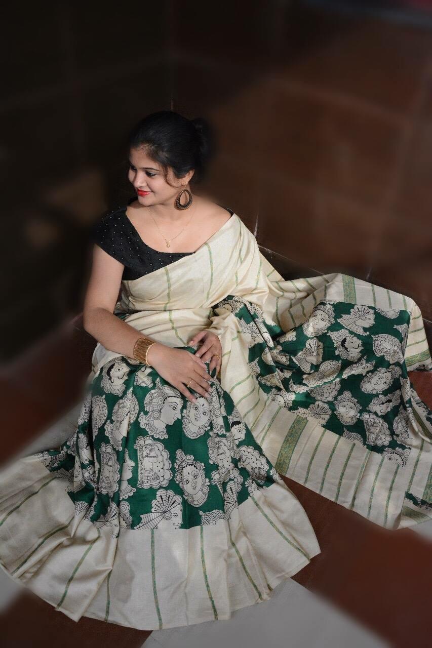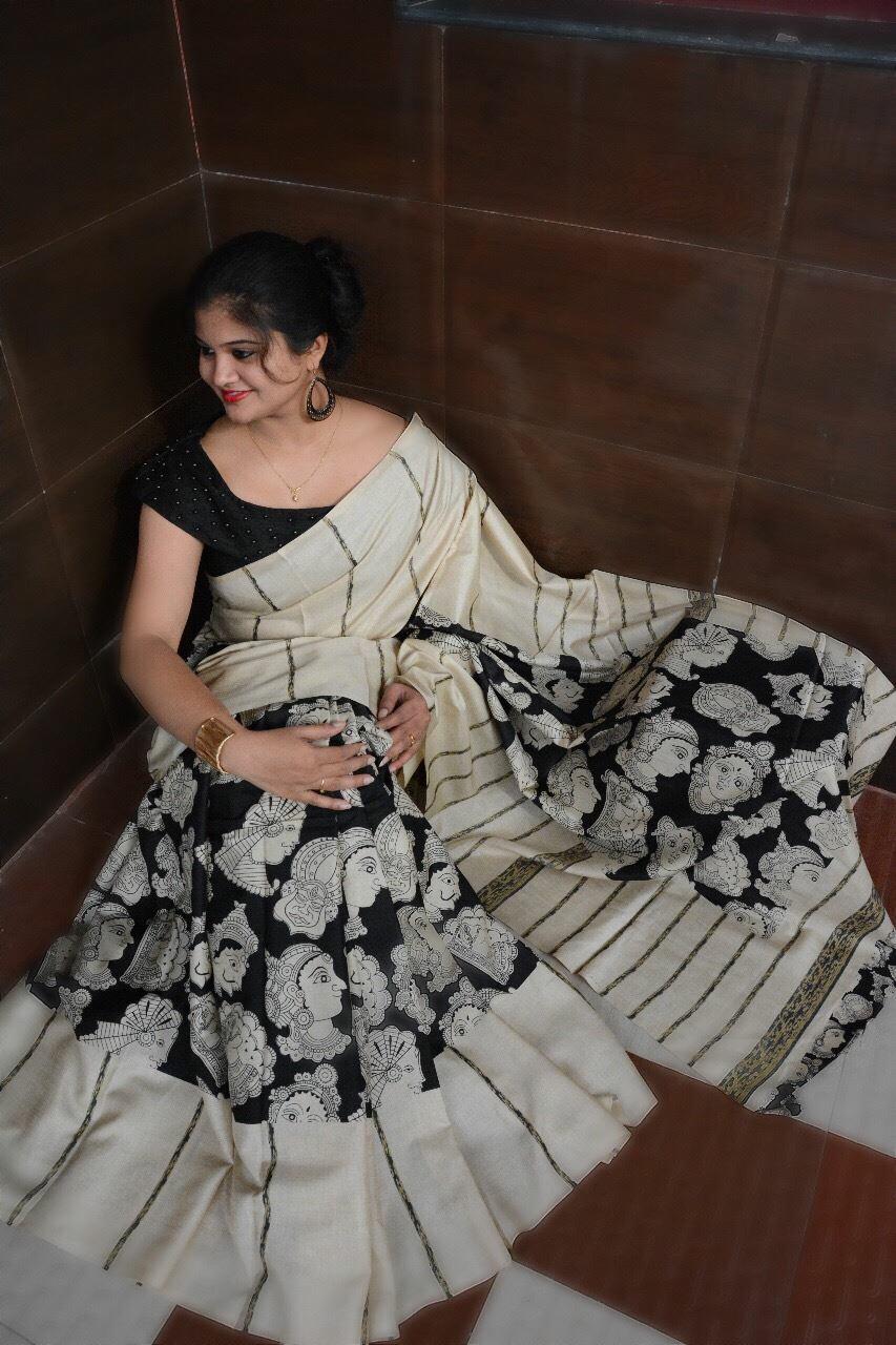 ? *Vivo nand* ? *Beautiful Handloom Linen Chanderi Sarees With Kalmkari beautiful Prints Along WiTh Running Blouse* Price @ *699* Gst ship extra * be aware of copy products* *|| Bulk stock || || Ready stock ||* |
