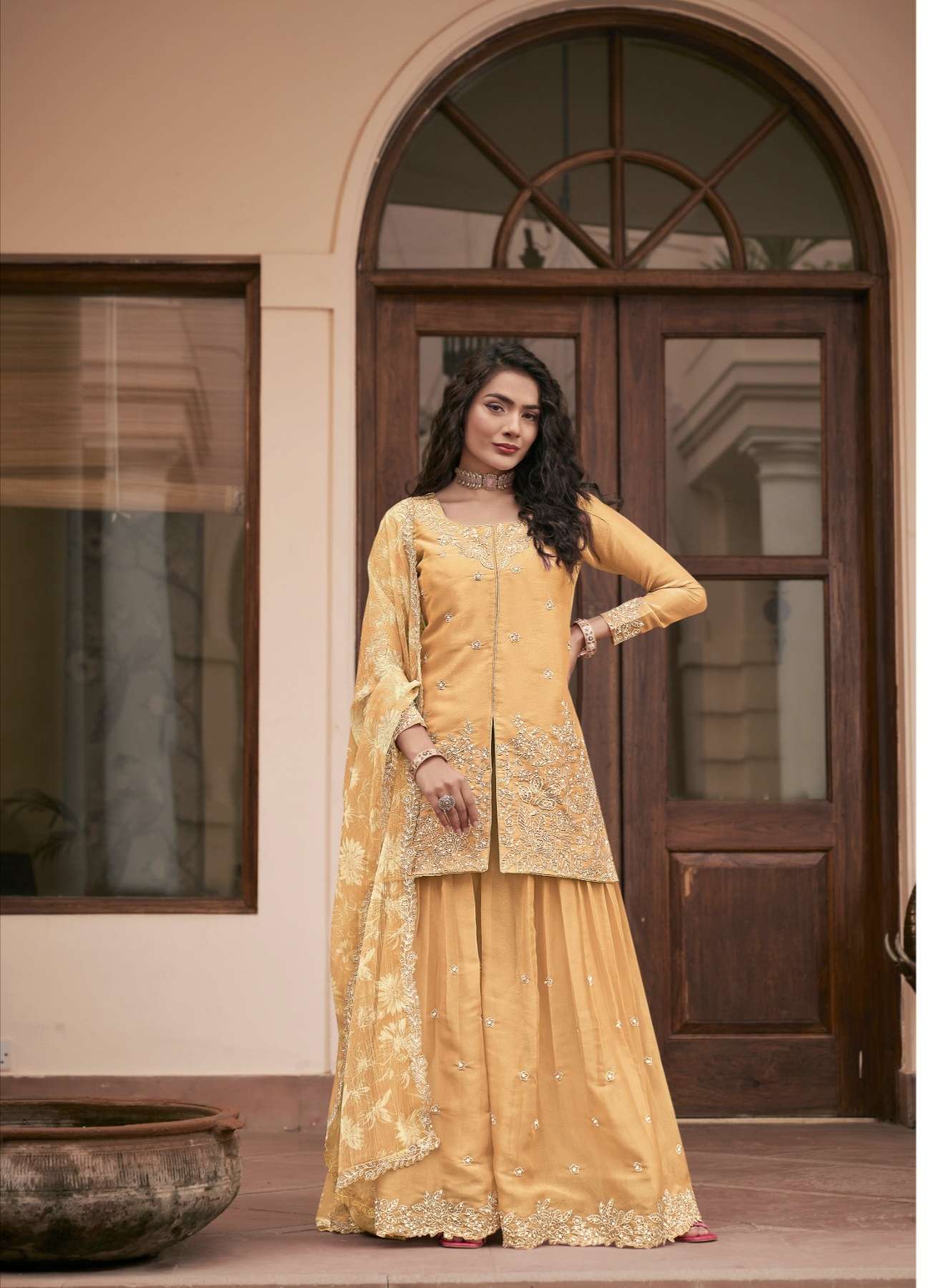 BOTTOM : HEAVY PREMIUM MOSSILK WITH FULL FLUR PLAZO WORK (FREE SIZE STITCHED)