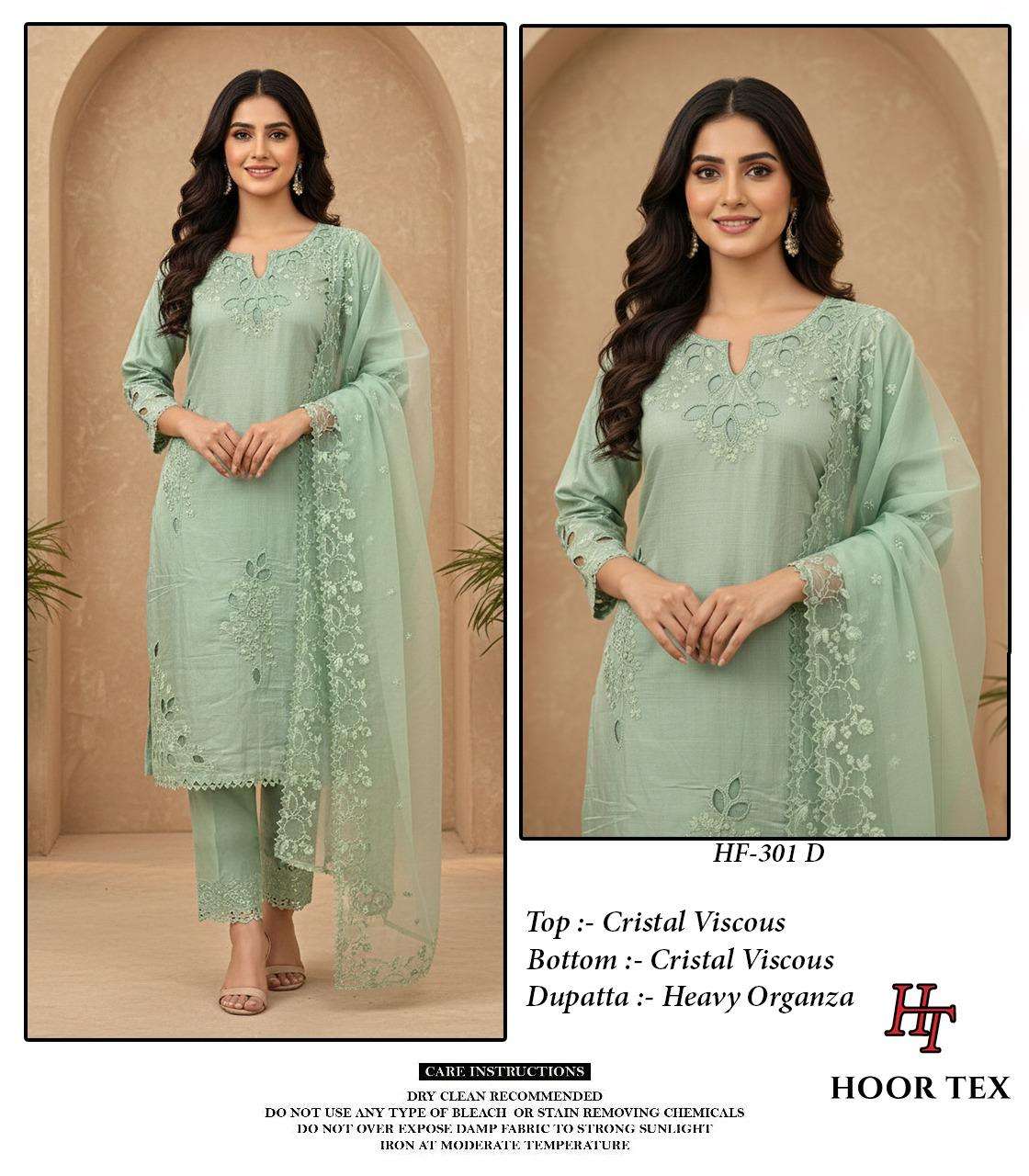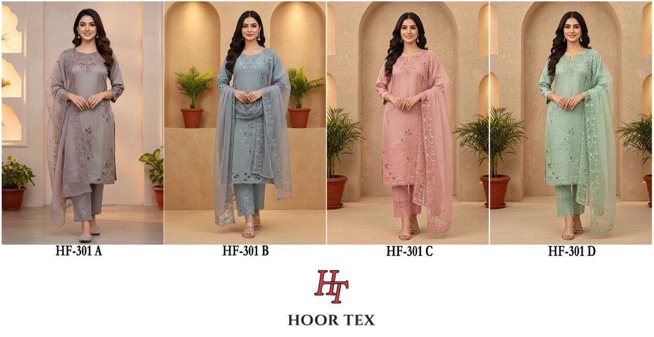 Buy Online HF 301 A To D by Hoor Tex Suit collection manufacturers surat 4 Pcs of Full Catalogue at Wholesale Price. Looking for HF 301 A To D by Hoor Tex Suit collection manufacturers surat Full Catalouge at Best Price? Buy Now HF 301 A To D by Hoor Tex Suit collection manufacturers surat at Wholesale Rate of Rs 5600 with Total 4 Pcs from authroized dealer and supplier of HOOR TEX Brand. Cost of Each piece is just only Rs 1400 which is very low and affordable price to resale the product in your retail store ,This is Surat based Wholesale Supplier & Dealer of HOOR TEX Brand. Click on Brand name to Know more about HOOR TEX Brand's products.Call or Whatsapp on 9898838984 for booking or enquiry