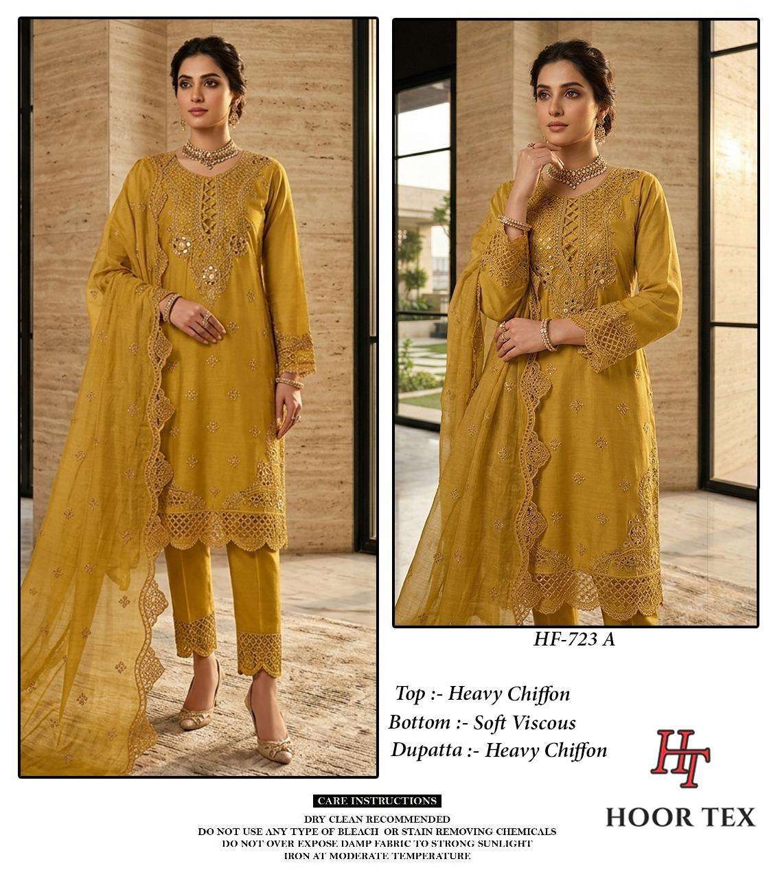 Buy Online HF 723 A To D by Hoor Tex suit collection manufacturers surat 4 Pcs of Full Catalogue at Wholesale Price. Looking for HF 723 A To D by Hoor Tex suit collection manufacturers surat Full Catalouge at Best Price? Buy Now HF 723 A To D by Hoor Tex suit collection manufacturers surat at Wholesale Rate of Rs 6000 with Total 4 Pcs from authroized dealer and supplier of HOOR TEX Brand. Cost of Each piece is just only Rs 1500 which is very low and affordable price to resale the product in your retail store ,This is Surat based Wholesale Supplier & Dealer of HOOR TEX Brand. Click on Brand name to Know more about HOOR TEX Brand's products.Call or Whatsapp on 9898838984 for booking or enquiry