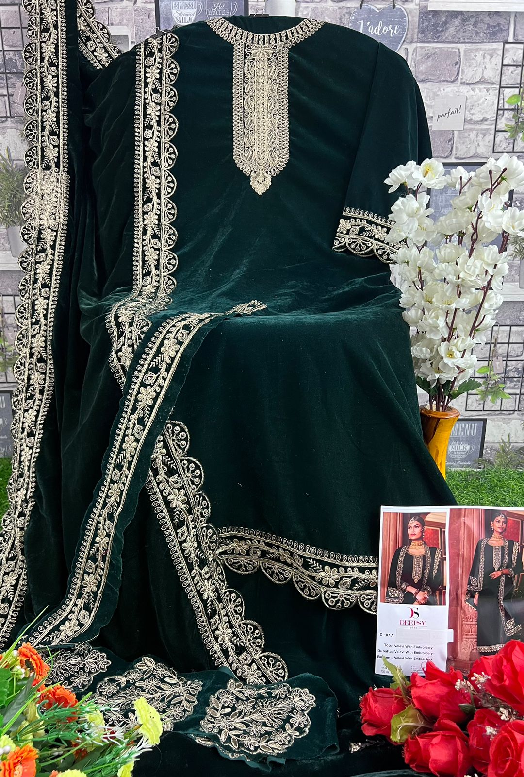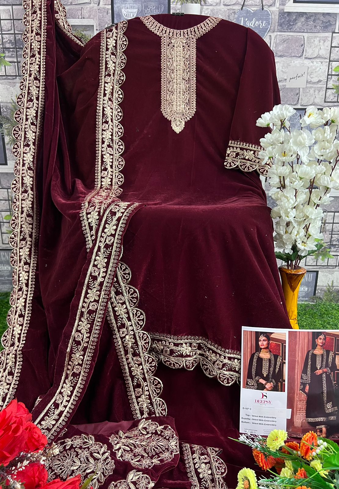 *HIT DEISGN OF VELEVT by DEEPSY SUITS* DESIGN NO.: 107 ABC Top -Velvet with heavy embroidery Bot - Velevt with embroidery Dup - Velevt with heavy embroidery Pcs: 3 *Rate - 1499+Gst* *_Splendid Quality With Digitally Printed Fabric_* *_Quilted Fabric Used For best quality results_* 100+Singles |