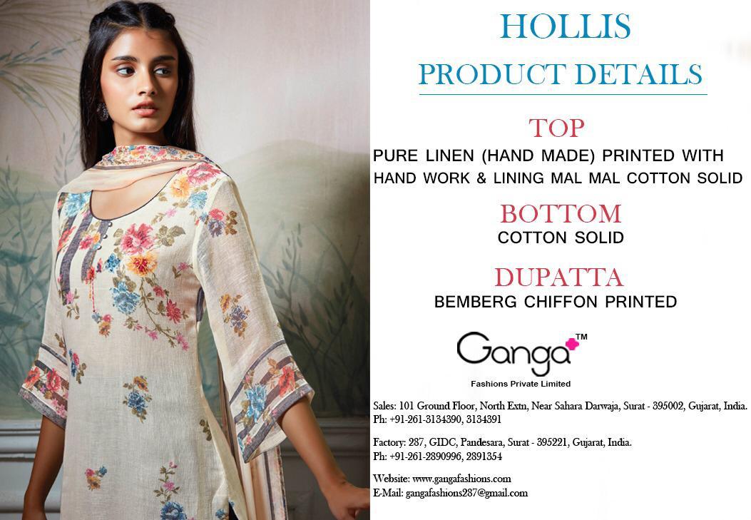 Buy Online Hollis By Ganga Linen Printed Worked Suits Wholesale Supplier Surat 9 Pcs of Full Catalogue at Wholesale Price. Looking for Hollis By Ganga Linen Printed Worked Suits Wholesale Supplier Surat Full Catalouge at Best Price? Buy Now Hollis By Ganga Linen Printed Worked Suits Wholesale Supplier Surat at Wholesale Rate of Rs 16515 with Total 9 Pcs from authroized dealer and supplier of GANGA Brand. Cost of Each piece is just only Rs 1835 which is very low and affordable price to resale the product in your retail store ,This is Surat based Wholesale Supplier & Dealer of GANGA Brand. Click on Brand name to Know more about GANGA Brand's products.Call or Whatsapp on 9898838984 for booking or enquiry