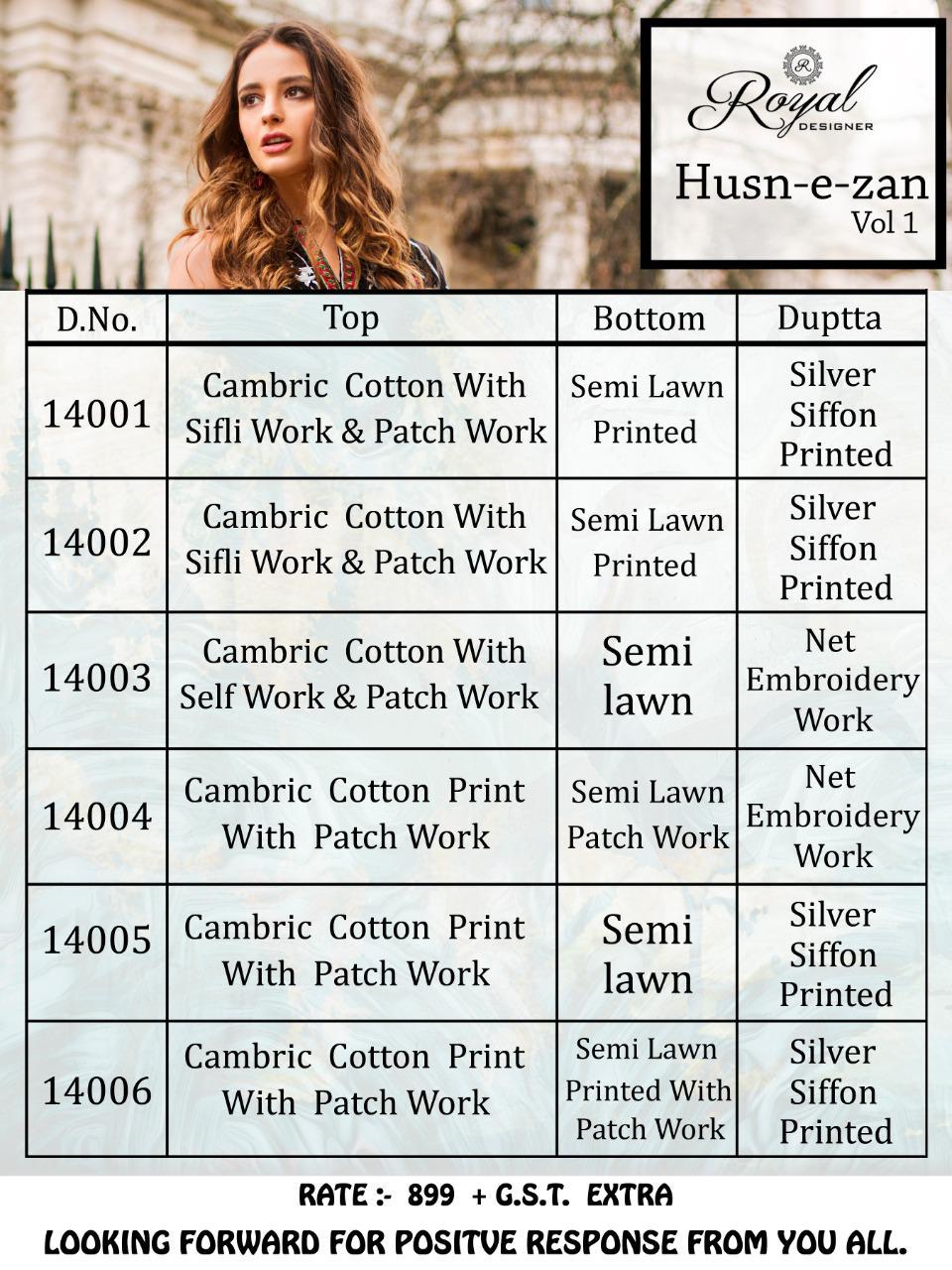 Buy Online Husn E Zan By Royal Designer Cambric Cotton Pakistani Suits Wholesale Supplier Nd Dealer Gujarat 6 Pcs of Full Catalogue at Wholesale Price. Looking for Husn E Zan By Royal Designer Cambric Cotton Pakistani Suits Wholesale Supplier Nd Dealer Gujarat Full Catalouge at Best Price? Buy Now Husn E Zan By Royal Designer Cambric Cotton Pakistani Suits Wholesale Supplier Nd Dealer Gujarat at Wholesale Rate of Rs 5394 with Total 6 Pcs from authroized dealer and supplier of Brand. Cost of Each piece is just only Rs 899 which is very low and affordable price to resale the product in your retail store ,This is Surat based Wholesale Supplier & Dealer of Brand. Click on Brand name to Know more about Brand's products.Call or Whatsapp on 9898838984 for booking or enquiry