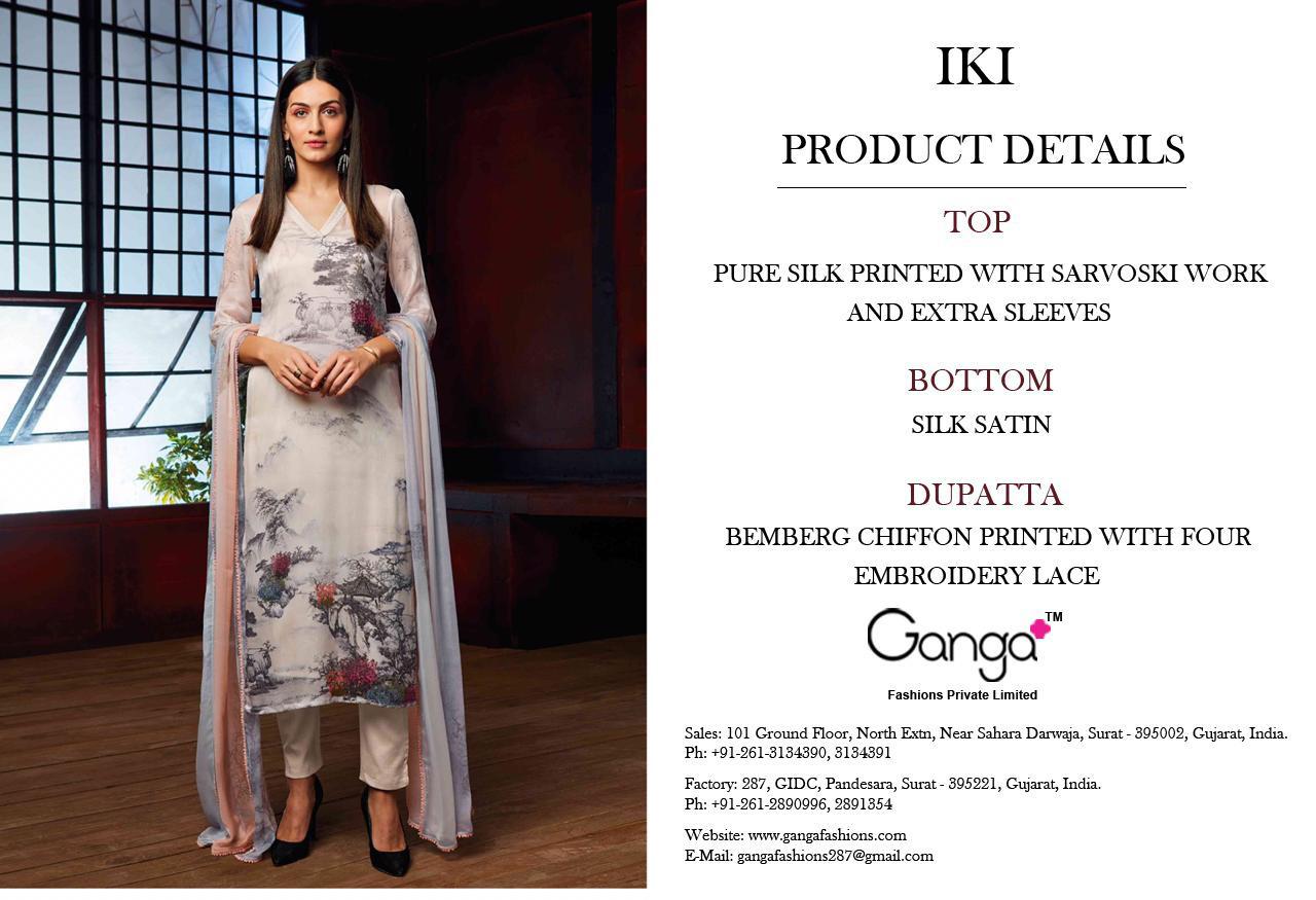*Ganga* Presents its latest designer Digital catalogue *IKI* Pure silk digital top with Swarovski work and silk satin bottom and bemberg chiffon printed dupatta with four side embroidery lave *2525?* Set to set 5%Gst Delivery tomorow |