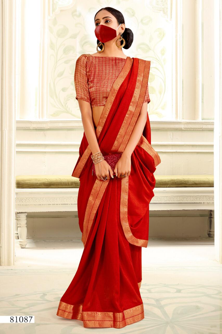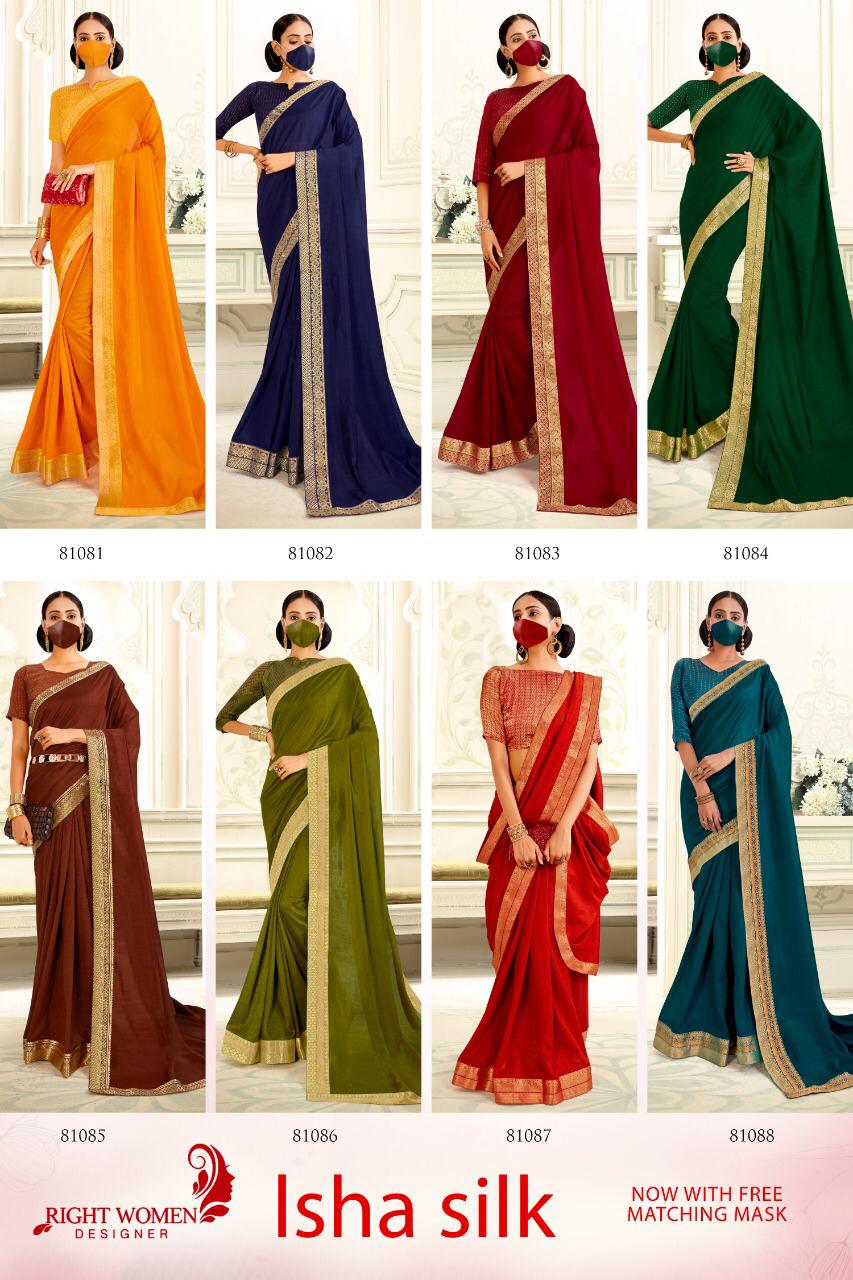 In***RIGHT WOMEN DESIGNER*** BRINGS YOU THE LATEST CATLOGUE be: *ISHA SILK* Brand:- *RIGHT WOMEN DESIGNER* Rate:- *310 ? * per pcs Fabric:- VICHITRA WITH JARI LACE AND BANARASI BLOUSE *WITH MASK* Packing pcs:-set to set Total Designs:- *8* Matching :- SINGLE COLOR DISPATCHING START |