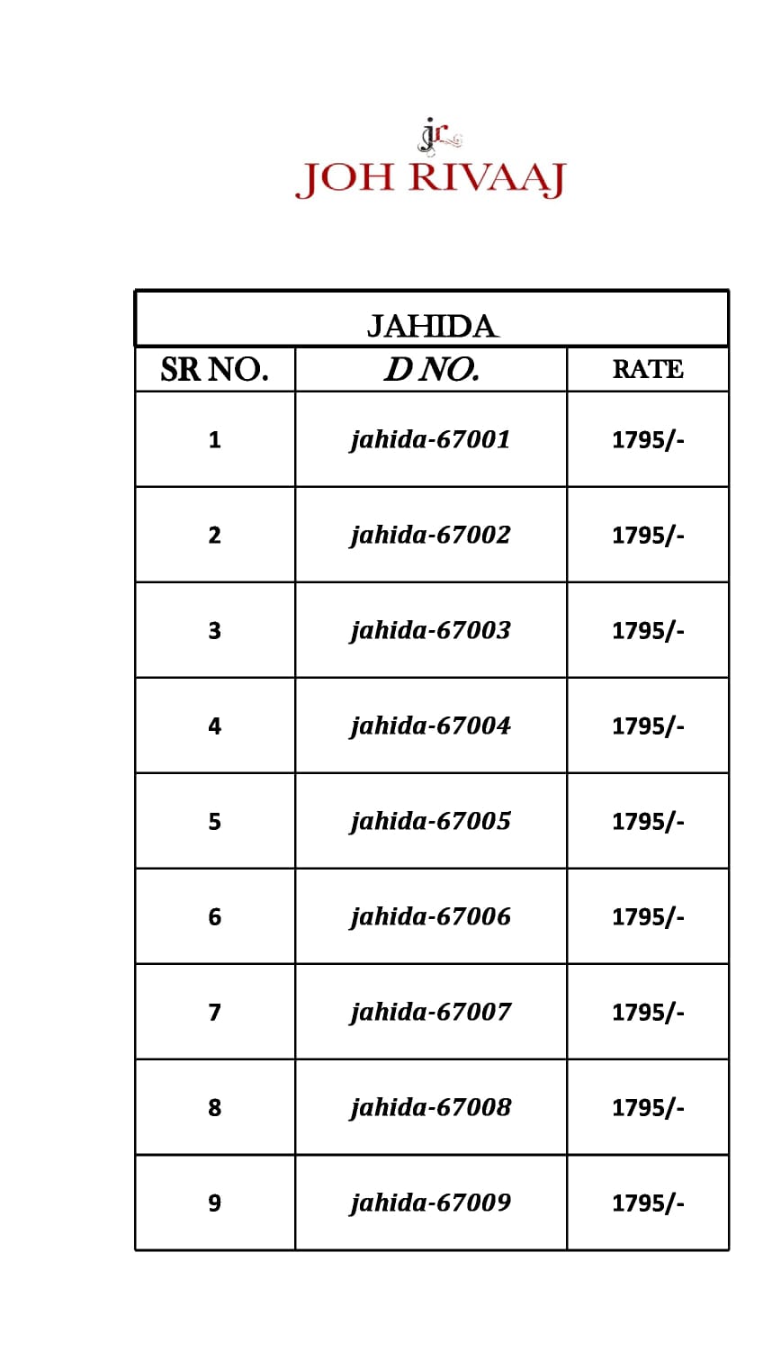 Buy Online Jahida Vol 670 Joh Rivaaj Fancy Sarees 9 Pcs of Full Catalogue at Wholesale Price. Looking for Jahida Vol 670 Joh Rivaaj Fancy Sarees Full Catalouge at Best Price? Buy Now Jahida Vol 670 Joh Rivaaj Fancy Sarees at Wholesale Rate of Rs 16155 with Total 9 Pcs from authroized dealer and supplier of JOH RIVAAJ Brand. Cost of Each piece is just only Rs 1795 which is very low and affordable price to resale the product in your retail store ,This is Surat based Wholesale Supplier & Dealer of JOH RIVAAJ Brand. Click on Brand name to Know more about JOH RIVAAJ Brand's products.Call or Whatsapp on 9898838984 for booking or enquiry