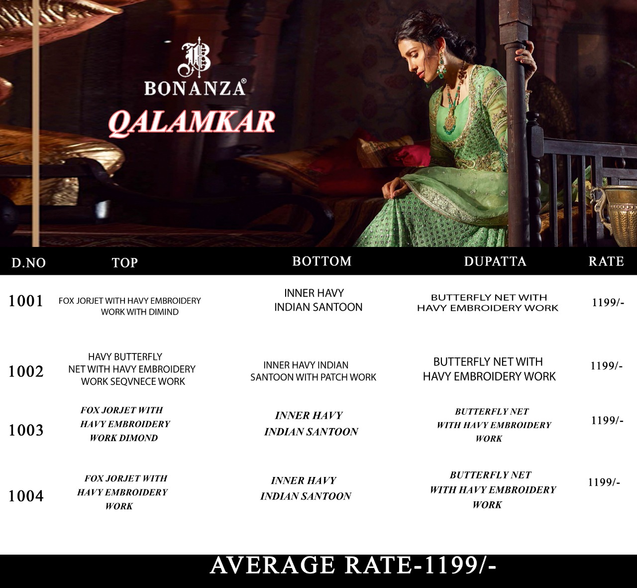 Buy Online Kalamkar By Bonanza Trendz Pakistani Suits Wholesale Supplier Gujarat 4 Pcs of Full Catalogue at Wholesale Price. Looking for Kalamkar By Bonanza Trendz Pakistani Suits Wholesale Supplier Gujarat Full Catalouge at Best Price? Buy Now Kalamkar By Bonanza Trendz Pakistani Suits Wholesale Supplier Gujarat at Wholesale Rate of Rs 4796 with Total 4 Pcs from authroized dealer and supplier of Brand. Cost of Each piece is just only Rs 1199 which is very low and affordable price to resale the product in your retail store ,This is Surat based Wholesale Supplier & Dealer of Brand. Click on Brand name to Know more about Brand's products.Call or Whatsapp on 9898838984 for booking or enquiry