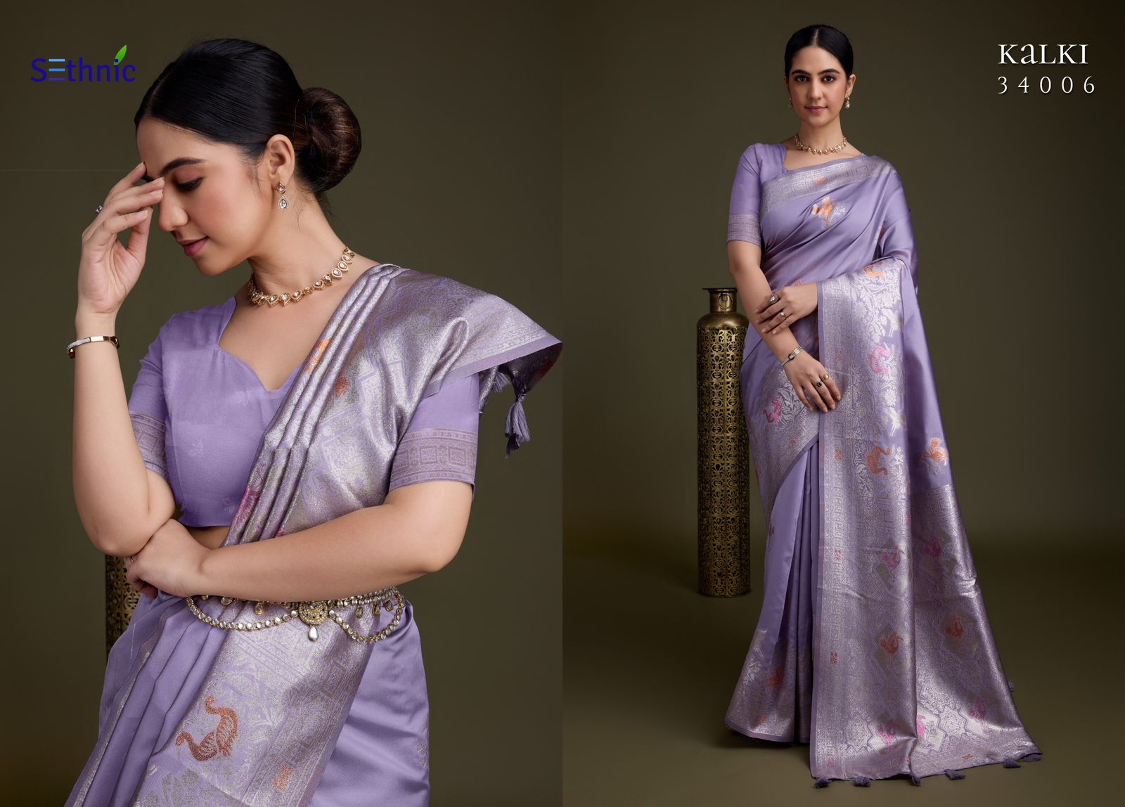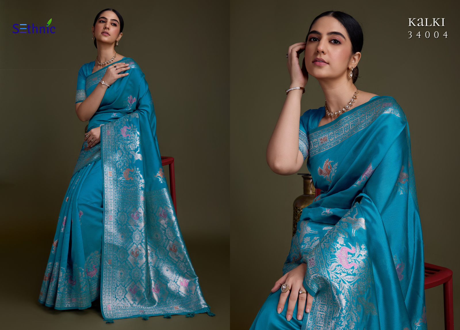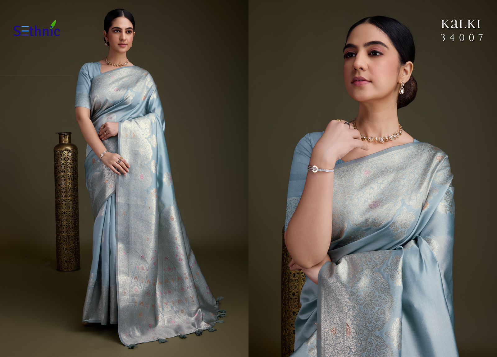 _Introducing Finest Silk Sarees with Meenakari - KALKI_ Unveiling this traditional Indian attire, featuring elegant silver zari work woven into rich silk fabric. Its shimmering patterns and luxurious texture make it ideal for weddings and special occasions, exuding timeless grace and sophistication. Brand: Sethnic Catalog: Kalki Series :34001 TO 34007 Saree Fabric : Soft Silk Work : Silver Zari Weaving + Multicolor Meenakari Zari Weaving Attached Attractive Tussles on Pallu_ Blouse : Solid Blouse with Sleeve Work Price: 799/-+5%GST Occasion: Festival Wear, Party Wear 100+singl |