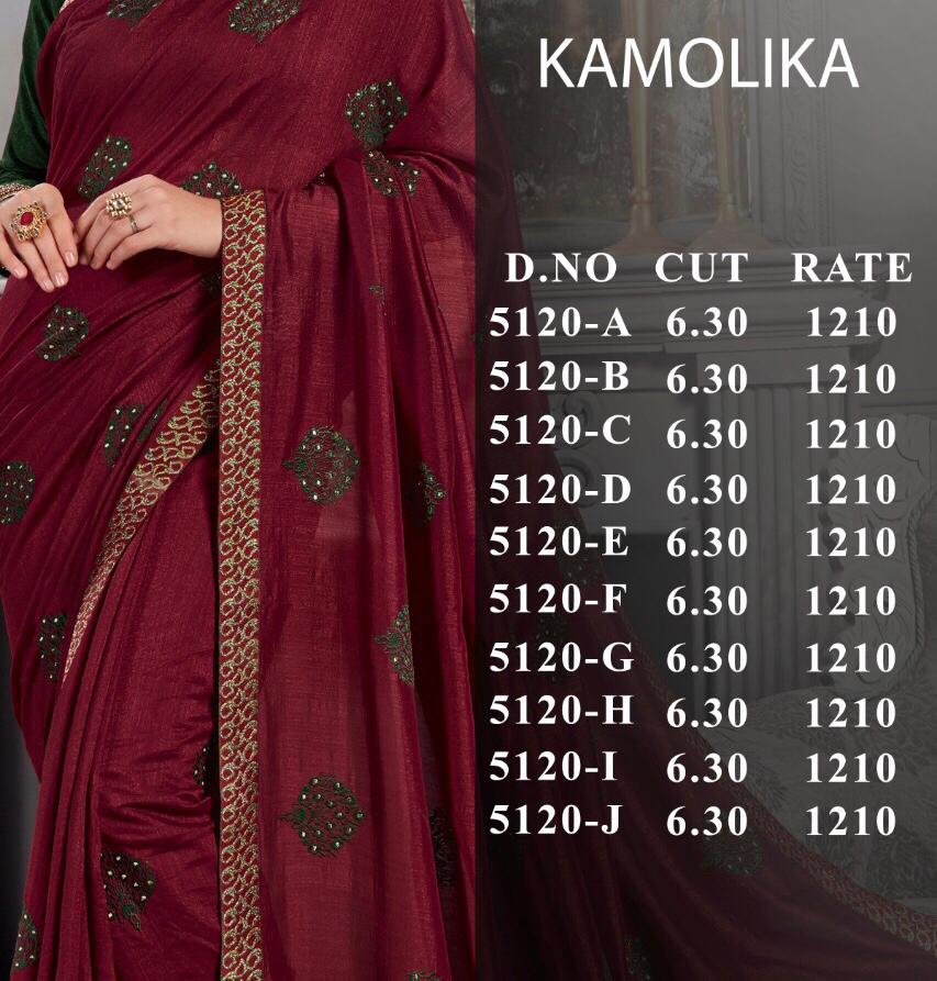 Buy Online Kamolika By Jai Chitra Series 5120 A To 5120 J Vichitra Silk Sarees Supplier Surat 10 Pcs of Full Catalogue at Wholesale Price. Looking for Kamolika By Jai Chitra Series 5120 A To 5120 J Vichitra Silk Sarees Supplier Surat Full Catalouge at Best Price? Buy Now Kamolika By Jai Chitra Series 5120 A To 5120 J Vichitra Silk Sarees Supplier Surat at Wholesale Rate of Rs 12100 with Total 10 Pcs from authroized dealer and supplier of BRAND'S Brand. Cost of Each piece is just only Rs 1210 which is very low and affordable price to resale the product in your retail store ,This is Surat based Wholesale Supplier & Dealer of BRAND'S Brand. Click on Brand name to Know more about BRAND'S Brand's products.Call or Whatsapp on 9898838984 for booking or enquiry