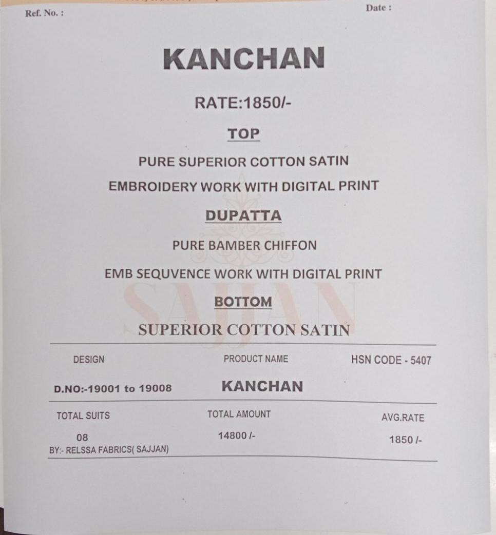 Buy Online Kanchan By Relisha Series 19001 Designer Party Wear Suits Wholesale Supplier Gujarat 8 Pcs of Full Catalogue at Wholesale Price. Looking for Kanchan By Relisha Series 19001 Designer Party Wear Suits Wholesale Supplier Gujarat Full Catalouge at Best Price? Buy Now Kanchan By Relisha Series 19001 Designer Party Wear Suits Wholesale Supplier Gujarat at Wholesale Rate of Rs 14800 with Total 8 Pcs from authroized dealer and supplier of Brand. Cost of Each piece is just only Rs 1850 which is very low and affordable price to resale the product in your retail store ,This is Surat based Wholesale Supplier & Dealer of Brand. Click on Brand name to Know more about Brand's products.Call or Whatsapp on 9898838984 for booking or enquiry