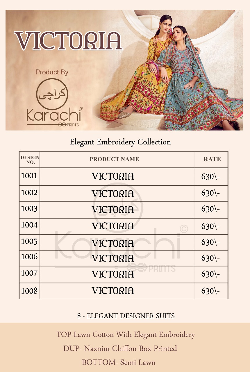 Buy Online Karachi Prints Present Victoria Embroidered Best And Most Evergreen Catalogue Wholesale Supplier And Dealer India 8 Pcs of Full Catalogue at Wholesale Price. Looking for Karachi Prints Present Victoria Embroidered Best And Most Evergreen Catalogue Wholesale Supplier And Dealer India Full Catalouge at Best Price? Buy Now Karachi Prints Present Victoria Embroidered Best And Most Evergreen Catalogue Wholesale Supplier And Dealer India at Wholesale Rate of Rs 5040 with Total 8 Pcs from authroized dealer and supplier of BRAND'S Brand. Cost of Each piece is just only Rs 630 which is very low and affordable price to resale the product in your retail store ,This is Surat based Wholesale Supplier & Dealer of BRAND'S Brand. Click on Brand name to Know more about BRAND'S Brand's products.Call or Whatsapp on 9898838984 for booking or enquiry