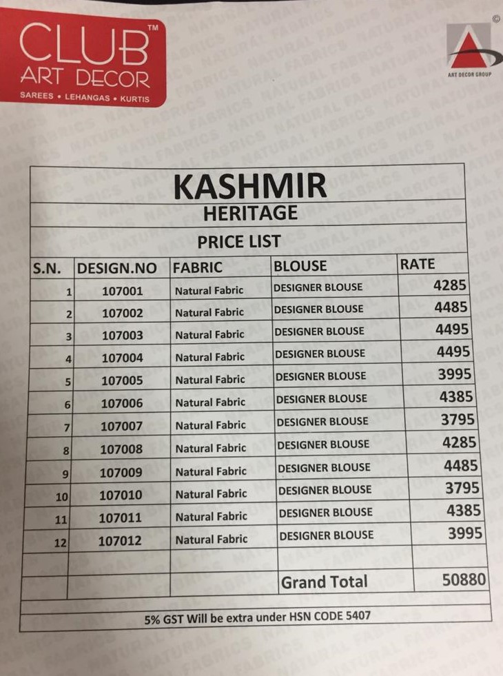 Buy Online Kashmir Haritage By Art Decore Party Wear Saree Single And Set Stockiest And Supplier From Surat 12 Pcs of Full Catalogue at Wholesale Price. Looking for Kashmir Haritage By Art Decore Party Wear Saree Single And Set Stockiest And Supplier From Surat Full Catalouge at Best Price? Buy Now Kashmir Haritage By Art Decore Party Wear Saree Single And Set Stockiest And Supplier From Surat at Wholesale Rate of Rs 0 with Total 12 Pcs from authroized dealer and supplier of Brand. Cost of Each piece is just only Rs 0 which is very low and affordable price to resale the product in your retail store ,This is Surat based Wholesale Supplier & Dealer of Brand. Click on Brand name to Know more about Brand's products.Call or Whatsapp on 9898838984 for booking or enquiry