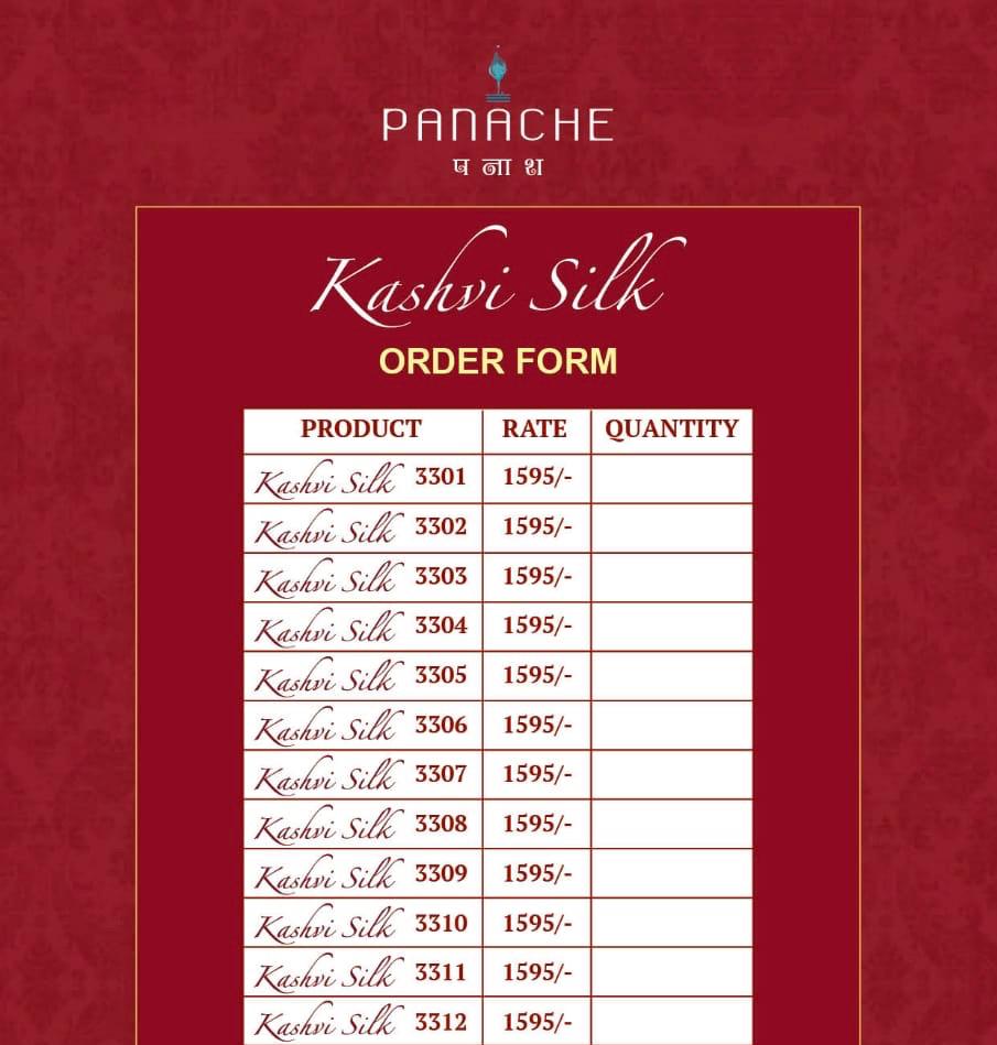 Buy Online Kashvi Silk By Panache Series 3301 Occasion Wear Sarees Wholesale Supplier Surat 12 Pcs of Full Catalogue at Wholesale Price. Looking for Kashvi Silk By Panache Series 3301 Occasion Wear Sarees Wholesale Supplier Surat Full Catalouge at Best Price? Buy Now Kashvi Silk By Panache Series 3301 Occasion Wear Sarees Wholesale Supplier Surat at Wholesale Rate of Rs 19140 with Total 12 Pcs from authroized dealer and supplier of BRAND'S Brand. Cost of Each piece is just only Rs 1595 which is very low and affordable price to resale the product in your retail store ,This is Surat based Wholesale Supplier & Dealer of BRAND'S Brand. Click on Brand name to Know more about BRAND'S Brand's products.Call or Whatsapp on 9898838984 for booking or enquiry
