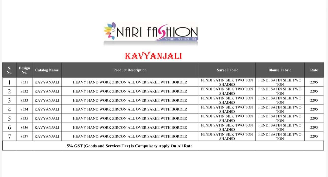 Buy Online KAVYANJALI by nari fashion saree Collection manufacturer surat 7 Pcs of Full Catalogue at Wholesale Price. Looking for KAVYANJALI by nari fashion saree Collection manufacturer surat Full Catalouge at Best Price? Buy Now KAVYANJALI by nari fashion saree Collection manufacturer surat at Wholesale Rate of Rs 16065 with Total 7 Pcs from authroized dealer and supplier of Nari Fashion Brand. Cost of Each piece is just only Rs 2295 which is very low and affordable price to resale the product in your retail store ,This is Surat based Wholesale Supplier & Dealer of Nari Fashion Brand. Click on Brand name to Know more about Nari Fashion Brand's products.Call or Whatsapp on 9898838984 for booking or enquiry