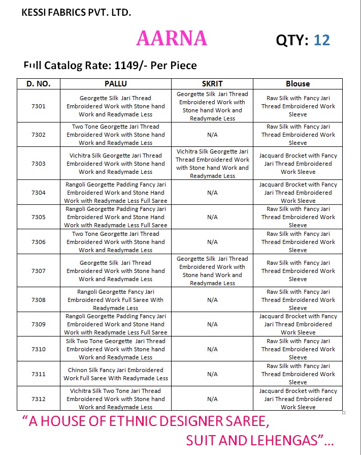 Buy Online Kessi Aarna 7301 Series Fancy Party Wear Georgette Silk Saree Collection Wholesale Dealer And Supplier Surat 12 Pcs of Full Catalogue at Wholesale Price. Looking for Kessi Aarna 7301 Series Fancy Party Wear Georgette Silk Saree Collection Wholesale Dealer And Supplier Surat Full Catalouge at Best Price? Buy Now Kessi Aarna 7301 Series Fancy Party Wear Georgette Silk Saree Collection Wholesale Dealer And Supplier Surat at Wholesale Rate of Rs 13788 with Total 12 Pcs from authroized dealer and supplier of KESSI Brand. Cost of Each piece is just only Rs 1149 which is very low and affordable price to resale the product in your retail store ,This is Surat based Wholesale Supplier & Dealer of KESSI Brand. Click on Brand name to Know more about KESSI Brand's products.Call or Whatsapp on 9898838984 for booking or enquiry