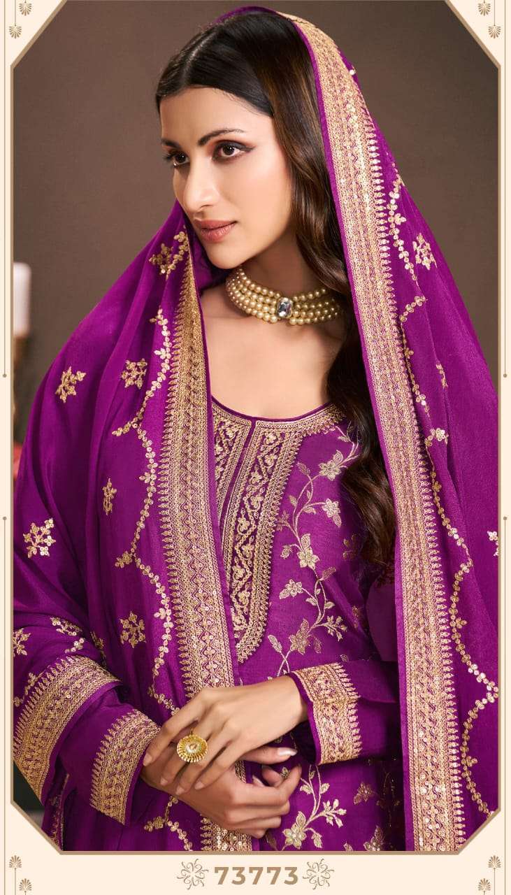 Type: Plazzo Style Suits Fabric Detail: Top :- Embroidered Monga Silk Jacquard Bottom :- Santoon Embroidered Dupatta :- Chinon Embroidered