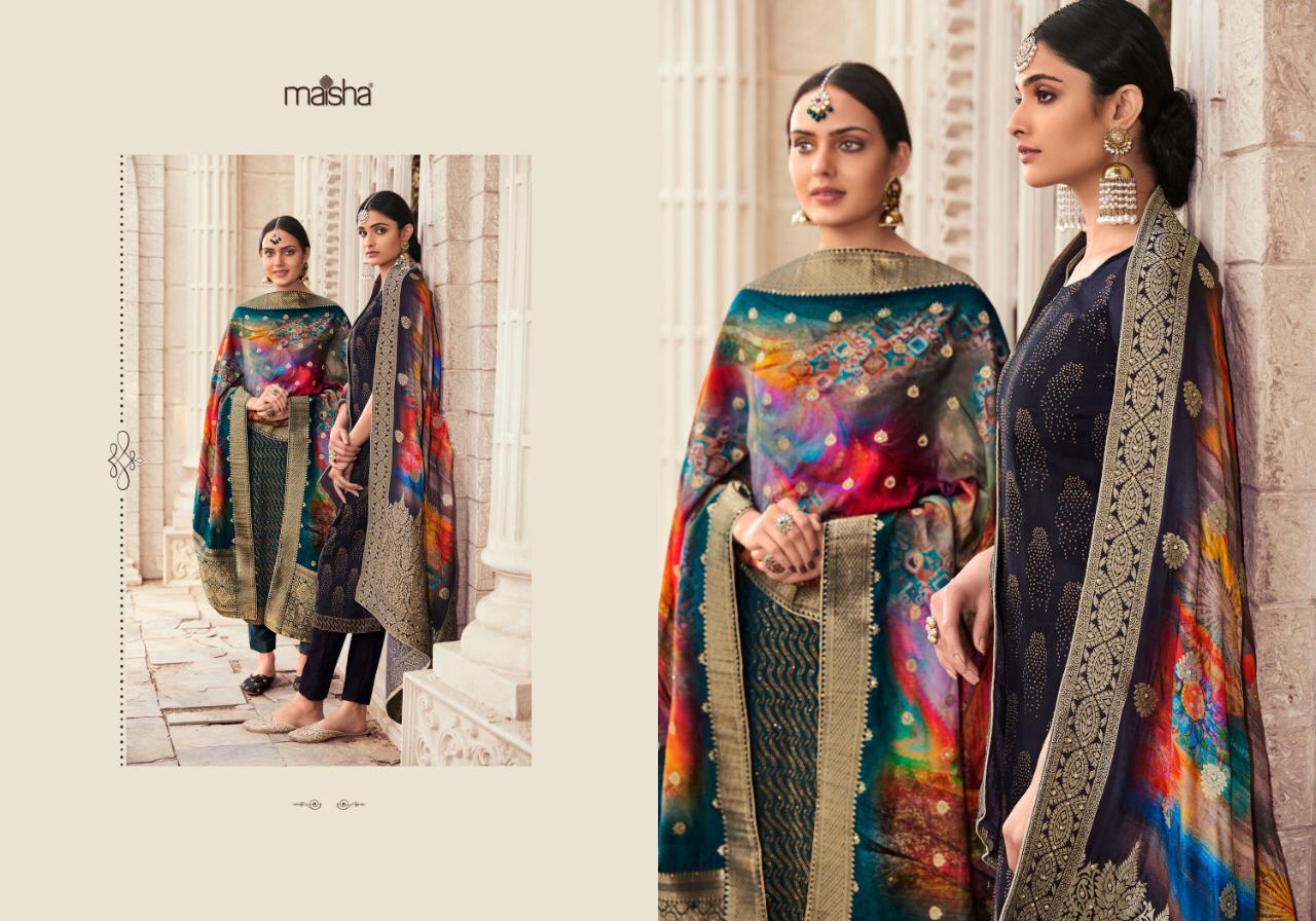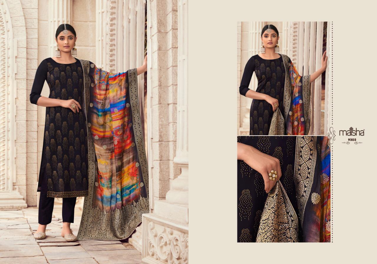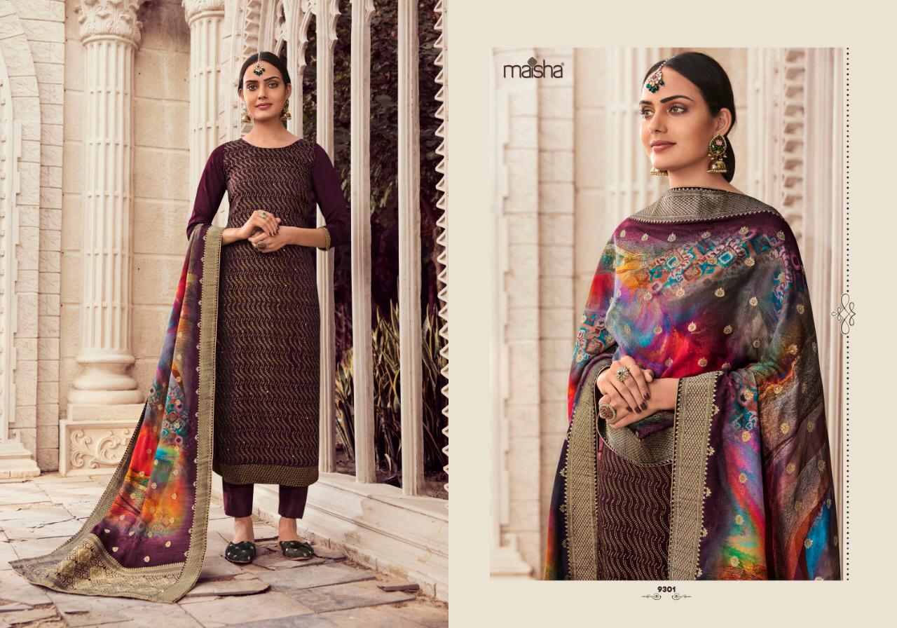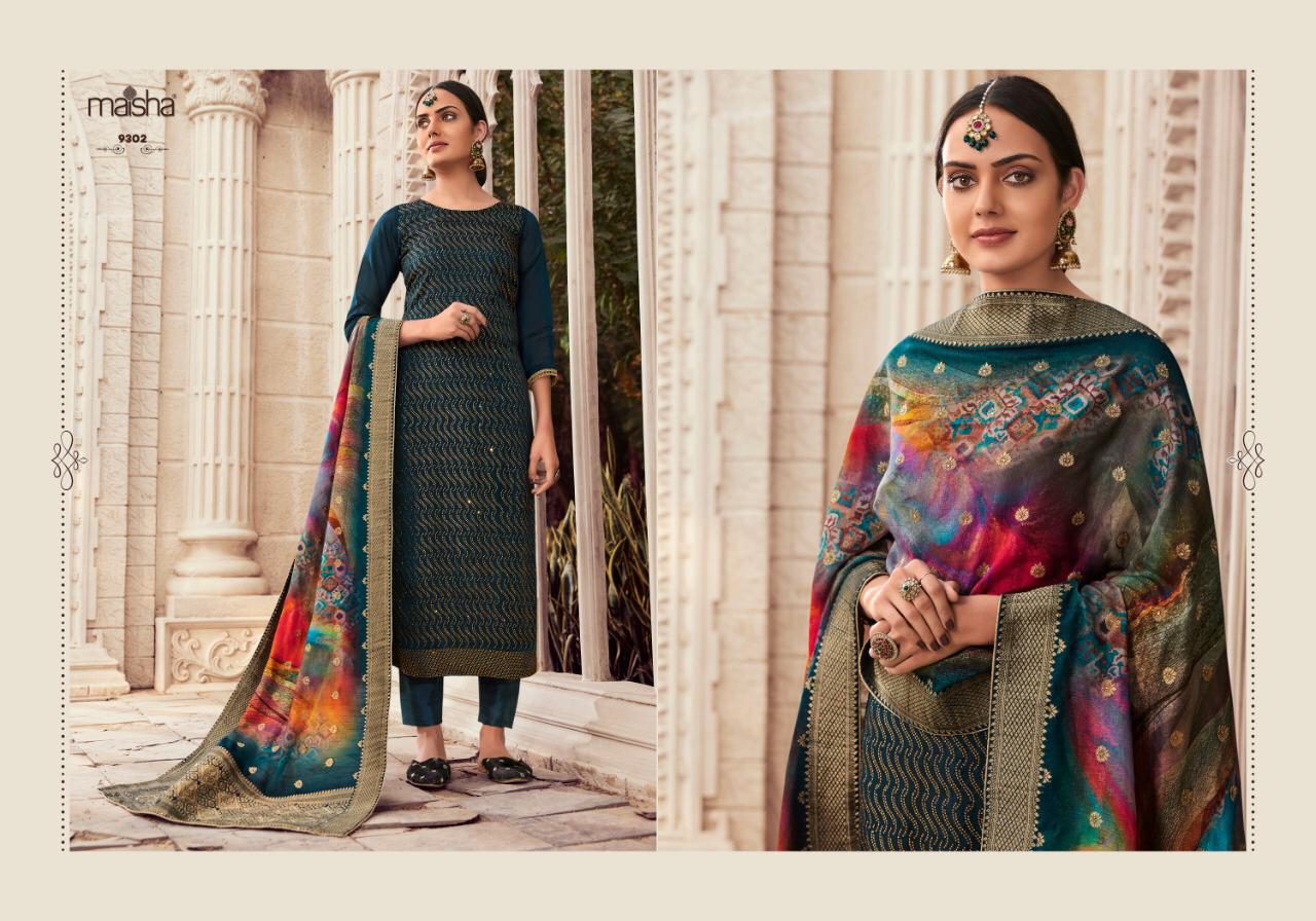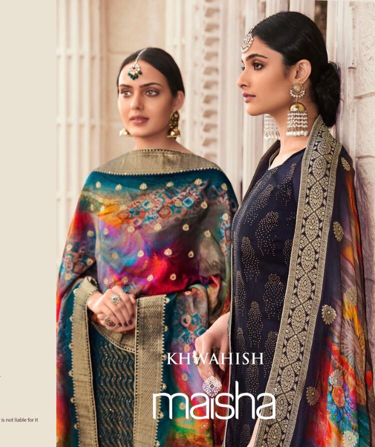 *" maisha "* Â?*We are launching Â?khawaishÂ?in heavy party wear* Catalog series 9301 to 9306 Fabrics----- ? Top - *Pure silk with heavy sarvoski work * ? Bottom - *viscose shantoon * Dhuppata-*pure dola zequard silk with digital print and diamond work* *Rate-2899-/-* Gst extra Set to set TypeÂ? *semistich* Regards Maiisa |