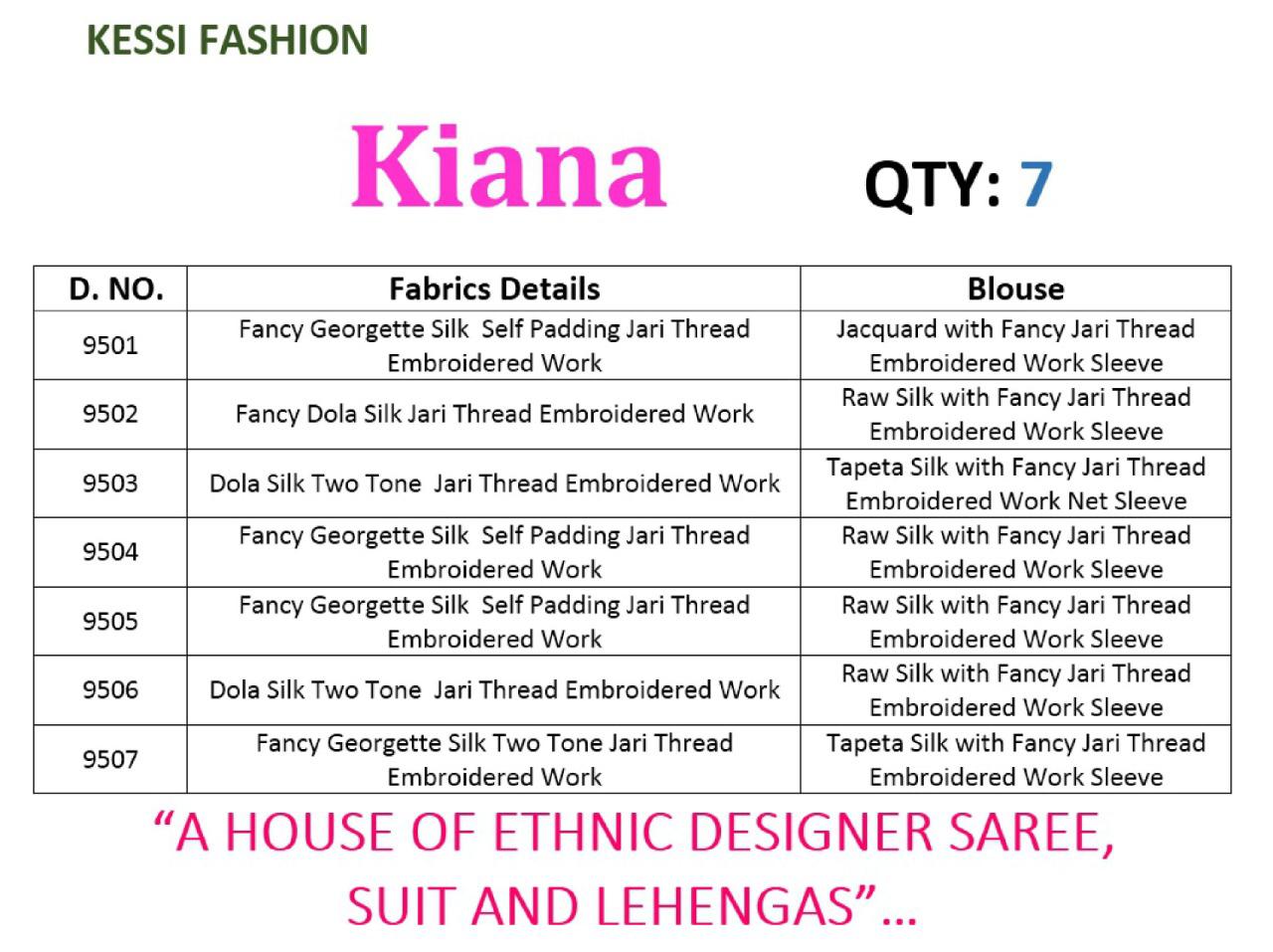 Buy Online Kiana By Kessi Series 9501 To 9507 Designer Sarees Set And Single Wholesale Supplier And Dealer Gujarat 7 Pcs of Full Catalogue at Wholesale Price. Looking for Kiana By Kessi Series 9501 To 9507 Designer Sarees Set And Single Wholesale Supplier And Dealer Gujarat Full Catalouge at Best Price? Buy Now Kiana By Kessi Series 9501 To 9507 Designer Sarees Set And Single Wholesale Supplier And Dealer Gujarat at Wholesale Rate of Rs 9793 with Total 7 Pcs from authroized dealer and supplier of KESSI Brand. Cost of Each piece is just only Rs 1399 which is very low and affordable price to resale the product in your retail store ,This is Surat based Wholesale Supplier & Dealer of KESSI Brand. Click on Brand name to Know more about KESSI Brand's products.Call or Whatsapp on 9898838984 for booking or enquiry