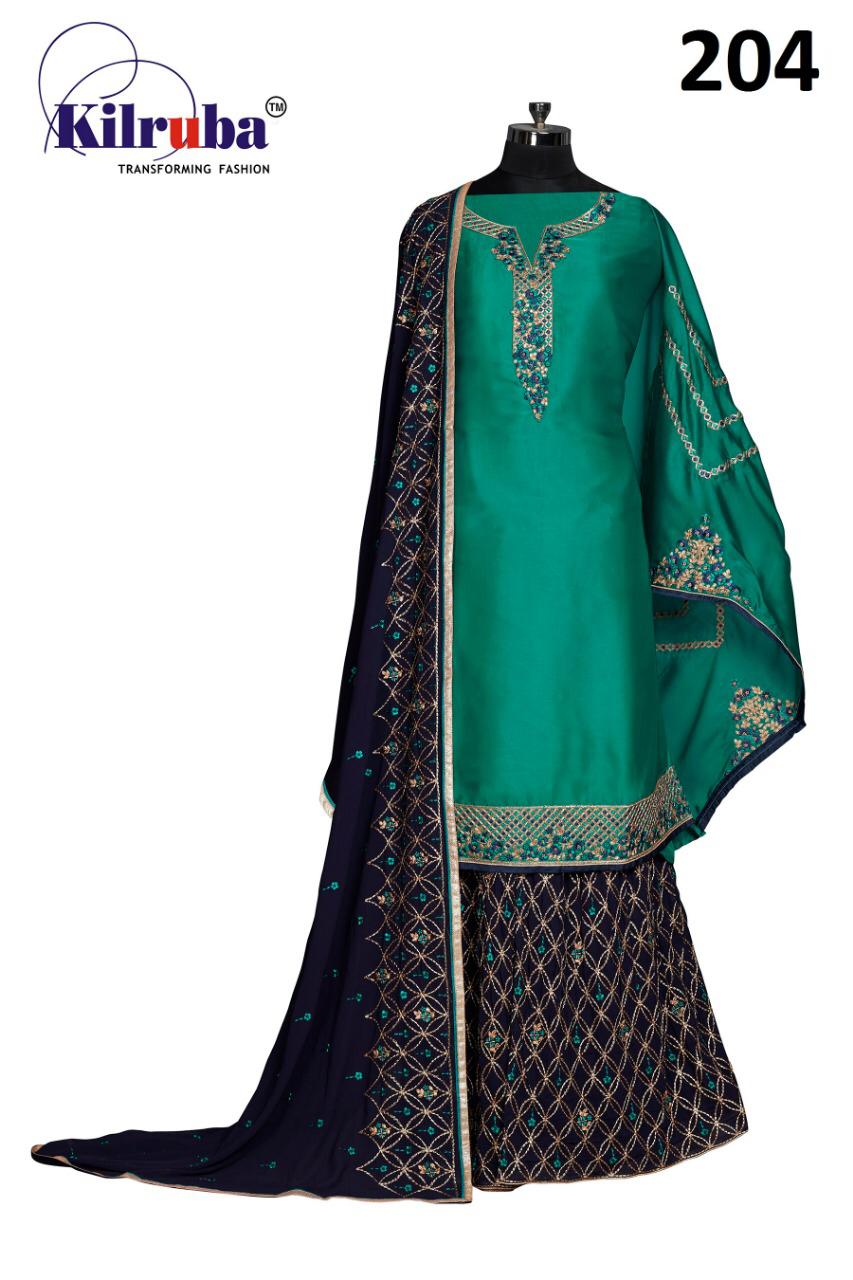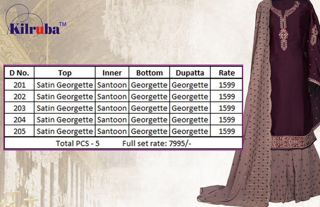Buy Online Kilruba 201 Series Fancy Satin Georgette Party Wear Sarara Suit Collection Wholesaler Surat 5 Pcs of Full Catalogue at Wholesale Price. Looking for Kilruba 201 Series Fancy Satin Georgette Party Wear Sarara Suit Collection Wholesaler Surat Full Catalouge at Best Price? Buy Now Kilruba 201 Series Fancy Satin Georgette Party Wear Sarara Suit Collection Wholesaler Surat at Wholesale Rate of Rs 7995 with Total 5 Pcs from authroized dealer and supplier of Brand. Cost of Each piece is just only Rs 1599 which is very low and affordable price to resale the product in your retail store ,This is Surat based Wholesale Supplier & Dealer of Brand. Click on Brand name to Know more about Brand's products.Call or Whatsapp on 9898838984 for booking or enquiry
